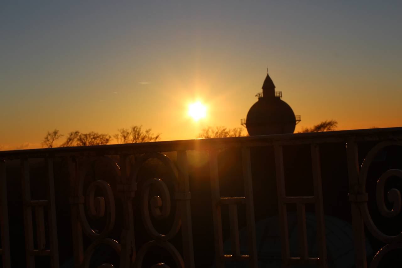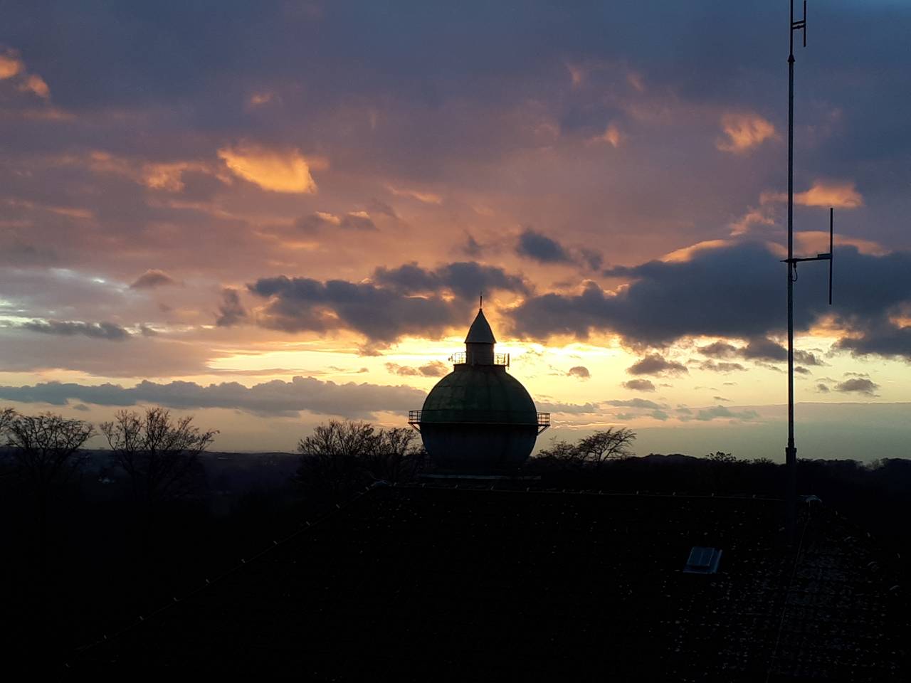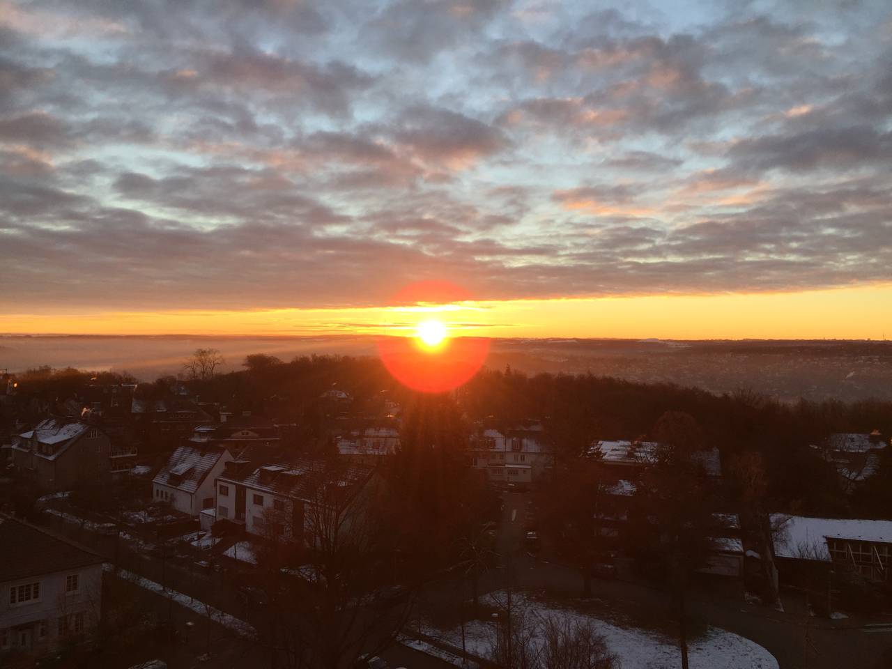 Unser Ziel ist der Goetheturm. Durch eine unscheinbare Tür und einen kleinen Versammlungsraum geht es für Susanne Schnell eine enge Wendeltreppe aus Stein hinauf. Die stellvertretende Schulleiterin steckt hinter den Kunstwerken der letzten Ausstellung an den weißen Wänden des Turms. Nach fast 100 Stufen werden wir mit einem phantastischen Blick über Essen belohnt. Hausmeister Martin Möller ist öfter hier oben und schwärmt von den Sonnenauf- und Untergangsbildern, die er hier schon gemacht hat. Gerne mit Freunden, einer Tasse Kaffee oder einem Gläschen Wein.