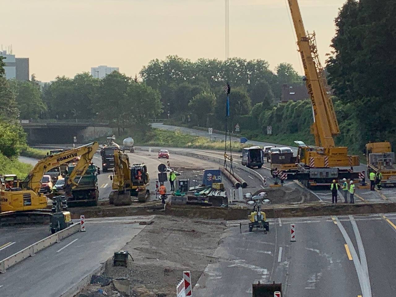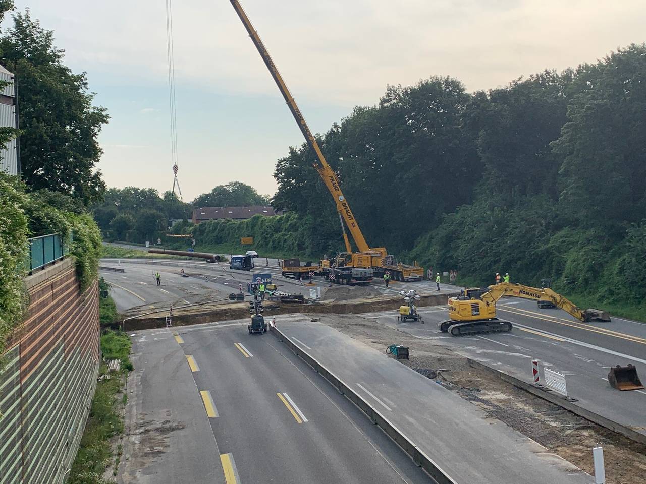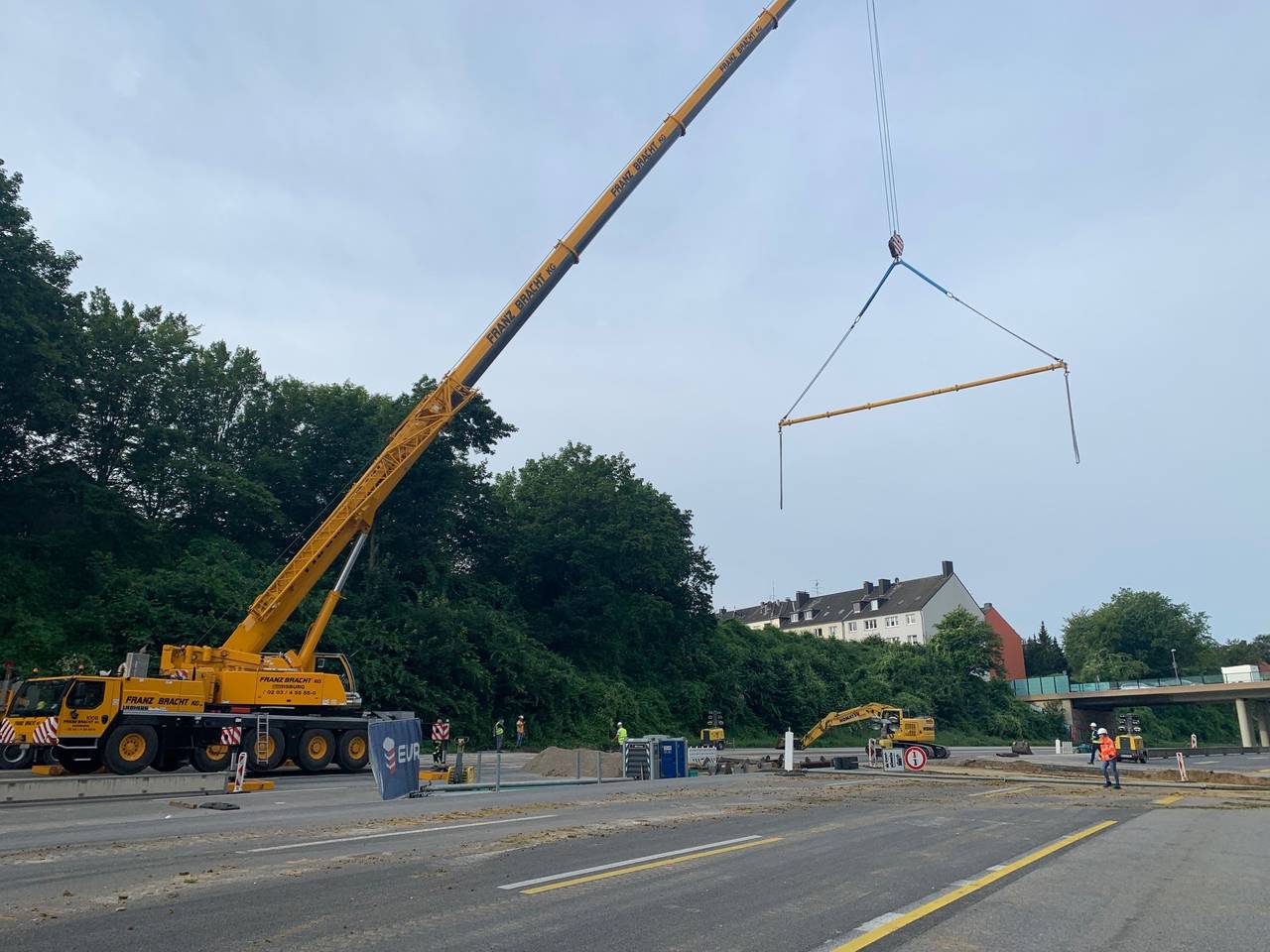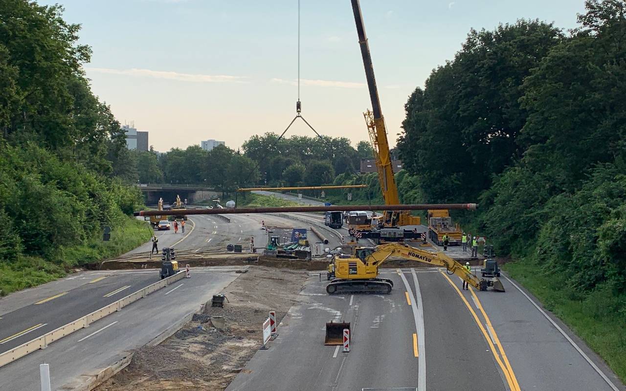 In Essen ist am Wochenende (24.-25. Juli) die A52 zwischen dem Dreieck Essen-Ost und dem Anschluss Essen-Süd komplett gesperrt. Dort baut die Steag das Fernwärme-Netz aus. Deshalb wurden am Samstagmorgen zwei 34 Meter lange Rohre quer über die Autobahn verlegt.
