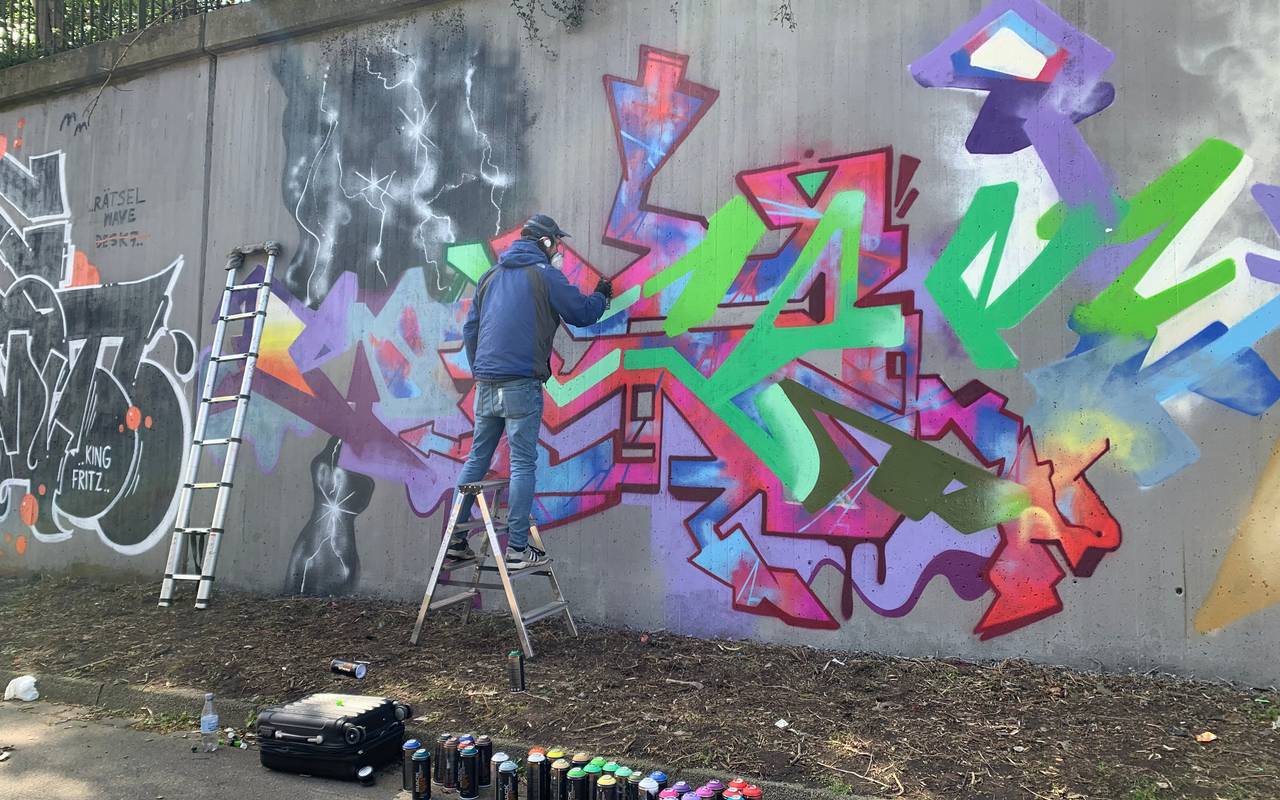 Die Wand sieht am Sonntag schon kunterbunt aus. Verschiedenste Bilder sind auf den großen Flächen zu sehen. Jeder Künstler kann hier seine eigenen Ideen umsetzten und der Fantasie freien Lauf lassen. So schmücken am Sonntag schon Tiere, Gesichter und abstrakte Formen die Wand. Die Künstler*innen kommen aus ganz Deutschland und machen das ehrenamtlich. Zwischen den Sprayern befinden sich auch 20 Essener Jugendliche. Sie erlernen in einem Workshop das Graffiti sprühen.