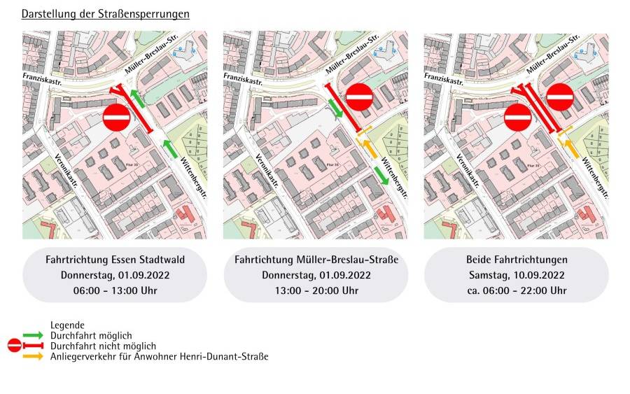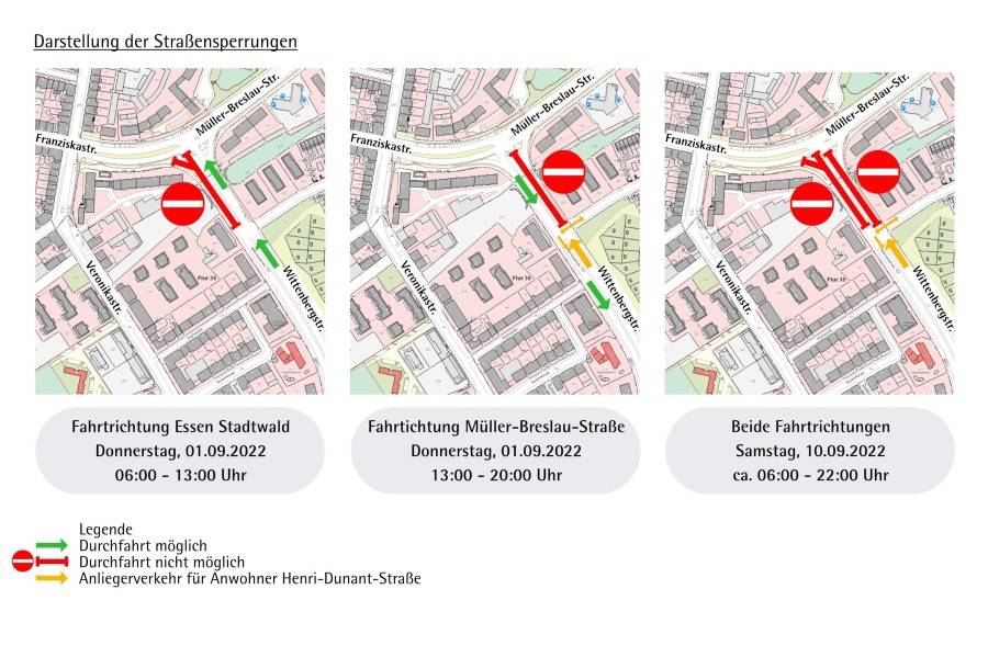 - Für den Autoverkehr: Franziskastraße, Martinstraße, Alfredstraße (B224), Bredeneyer Kreuz, Frankenstraße bis zur Wittenbergstraße und in Gegenrichtung analog