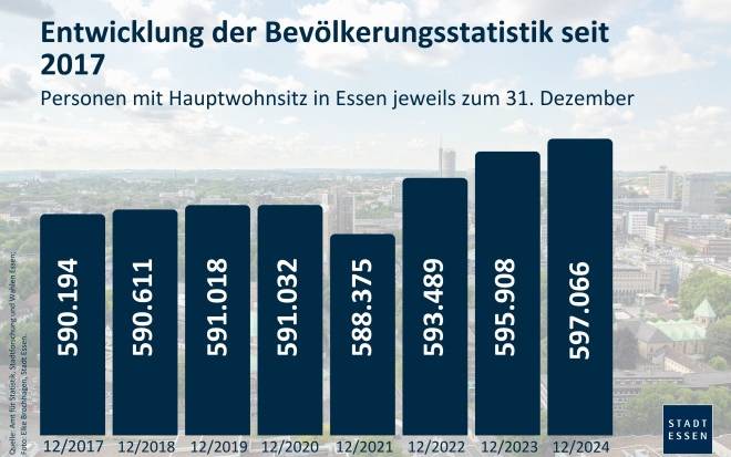Zum Ende des Jahres (2024) gibt es von der Stadt Essen wieder eine Auswertung darüber, wie viele Menschen in Essen leben. Mit dem Ergebnis: Die Zahl ist weiter gestiegen.