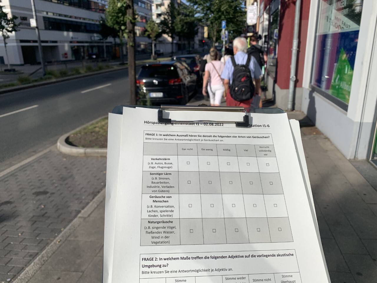 "Die drei Minuten Hörzeit starten jetzt", erklärt Jonas Hornberger - ab dann wird zugehört. Drei Minuten lang stehen die Teilnehmerinnen und Teilnehmer des Hörspaziergangs in der Innenstadt einfach nur da. Manche schließen ihre Augen, um sich noch besser auf das Hören zu konzentrieren. Nach den drei Minuten werden dann die Eindrücke in einen Fragebogen eingetragen. Darauf soll man zum Beispiel bewerten, wie angenehm oder chaotisch man die Geräuschkulisse wahrgenommen hat. Organisiert wird das Projekt vom Institut für Public Health an der Uniklinik in Holsterhausen. Schon im Juni gab es solche Hörspaziergänge, zu denen sich an jedem Termin maximal fünf Teilnehmer:innen anmelden können. Und sie waren auf der Tour durch die Innenstadt begeistert von ihren Eindrücken. Viele sagten sogar, dass sie in Zukunft öfter mal "die Knöpfe aus dem Ohr" nehmen wollen, um aktiver hinzuhören.
