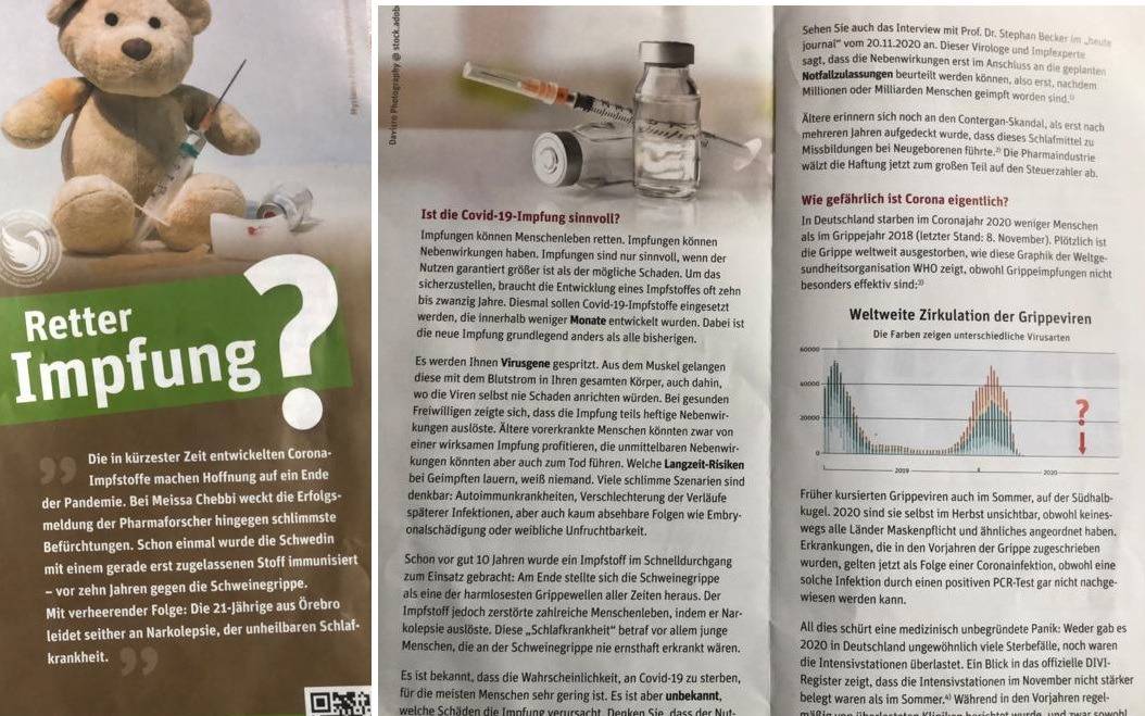 Mindestens einer der Flyer stammt von der Gruppe Freiheitsboten, die sich auch in Essen über die App Telegram organisiert. Nach eigenen Angaben kooperieren sie bei den Flyern mit verschiedenen Gruppen, wie "Ärzte für Aufklärung". Sie gilt als Anheizer für Anhänger von Verschwörungserzählungen, warnt vor "Zwangs-Imfungen" und mehreren Millionen Toten. Die zuständige Hamburger Ärztekammer distanziert sich bereits von den Aussagen auf dem Flyer und prüft, ob die Aussagen berufsrechtlich zu beanstanden sind. Auch der Verein "Mediziner und Wissenschaftler für Gesundheit, Freiheit und Demokratie" (MWGFD e.V.) mit Sitz in Passau wird genannt. Kritiker werfen diesem erst 2020 gegründeten Verein vor, dass sein Hauptzweck allein darin bestehe, gegen die Maßnahmen zur Eindämmung der Corona-Pandemie vorzugehen.