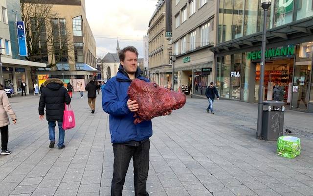 In der Essener Innenstadt gab es am Dienstag einen besonders ekligen Protest gegen Tierquälerei. Aktivisten von PETA zeigen eine täuschend echte Attrappe eines blutigen Kuhkopfes. Sie sagen, dass jedes Jahr anderthalb Millionen Tiere qualvoll für Leder sterben müssen. Die Aktivisten fordern, dass es mehr vegane Kleidung gibt, damit dafür keine Tiere mehr sterben müssen. Die Protestaktion ist heute Mittag (25. Februar) vor der Marktkirche in der Innenstadt.