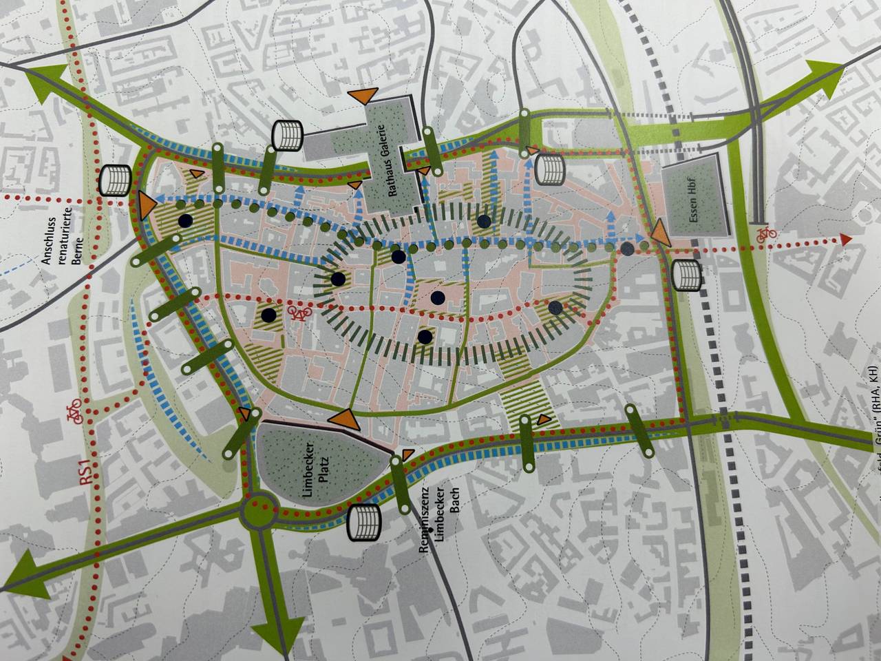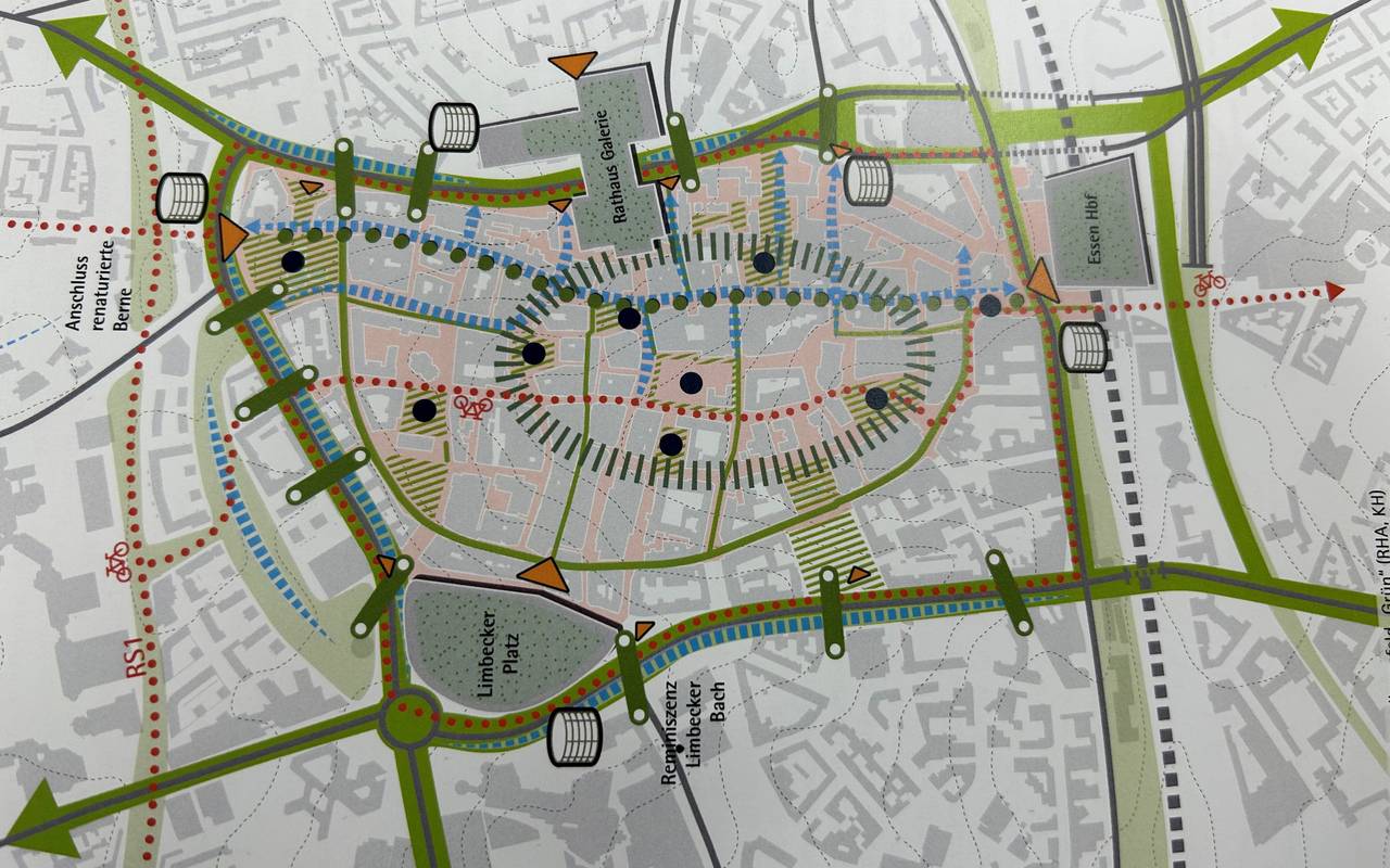 Die Stadt Essen hat als Grundlage für das Leitbild erst einmal die Stärken und Schwächen zusammen getragen. Zu den Stärken gehören die Gastronomie in der Innenstadt, die direkte Nähe zum Hauptbahnhof, viele Veranstaltungen vom Essen Light Festival über die Lichtwochen bis zum Weihnachtsmarkt. Noch immer lässt sich ein Teil der alten Stadtstruktur erkennen und es gibt viele Denkmäler in der Innenstadt, die man aber erst einmal wahrnehmen muss. Zu den Schwächen gehören die vielen Flächen, die zugebaut und asphaltiert sind, die schlechte Anbindung in den Abend- und Nachtstunden mit Bus und Bahn und damit wenig Leben abends und nachts in der Innenstadt. Die Stadt sieht jetzt die Chancen darin, dass die Innenstadt grüner werden soll. Dafür gibt es schon eine erste Idee. Danach ziehen sich grüne Bänder vom Hauptbahnhof bis zum Viehofer Platz, daran entlang auch ein blaues Band. Das bedeutet, da könnte in Zukunft Wasser lang fließen. Aber auch an den Rändern der Innenstadt auf der Hindenburgstraße und der Schützenbahn schlängeln sich solche Bänder entlang. Was das in Zukunft für den Verkehr bedeuten wird, das bleibt offen. Aber um ein paar Spuren werden die beiden Straßen wohl kleiner werden, darüber denkt der Stadtplanungsdezernent Martin Harter laut nach.