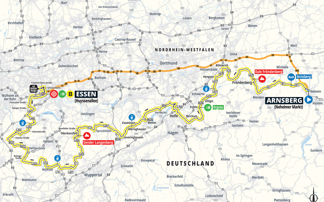 Die Radprofis starten am 26. August im Sauerland, fahren an der Ruhr entlang bis Essen. Dabei lassen sie allerdings den Baldeneysee aus. Am selben Tag ist im Seaside-Beach das Konzert von Peter Fox. Deshalb müssen die Radfahrer auch die Messe Essen umfahren. Dort starten die Shuttle-Busse zum Konzert von Peter Fox. Auch Zollverein wurde vom Plan gestrichen. Dort ist am letzten August-Wochenende die Gourmetmeile. Die Radfahrer werden am 26.08. gegen 16:30 Uhr in Kettwig ankommen, fahren über Haarzopf, Fulerum und Holsterhausen in die Innenstadt und drehen zwei Runden um den Berliner Platz. Das Ziel ist an der Philharmonie.