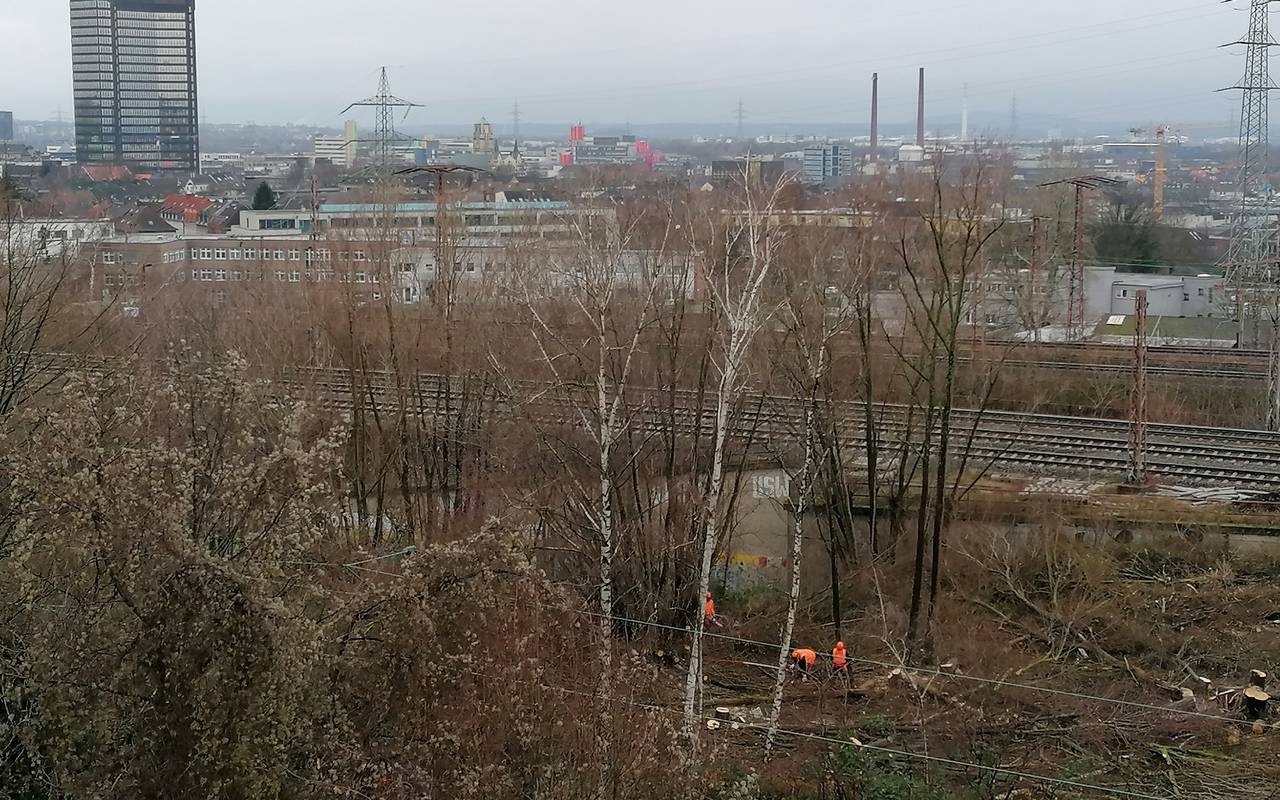 Der kleine Waldstreifen lag genau neben den Bahngleisen. Bei Sturm hätten die Bäume auf die Gleise kippen können, sagt die Bahn AG. Deshalb mussten alle Bäume weg. Die meisten waren sehr hoch und hatten einen sehr dünnen Stamm. Es gibt sogar es eine Formel, um die Sicherheit eines Baumes zu berechnen. Je höher der Baum, umso dicker muss der Stamm sein, damit er als sicher gilt. Wenn der Durchmesser nicht ausreicht, dann kann der Baum umknicken bei Wind und wird gefällt. Einige Stämme waren etwas dicker, aber auch diese Bäume kamen weg, weil sie frei im Wind gestanden hätten, ohne die dünnen Bäume als Windschutz.