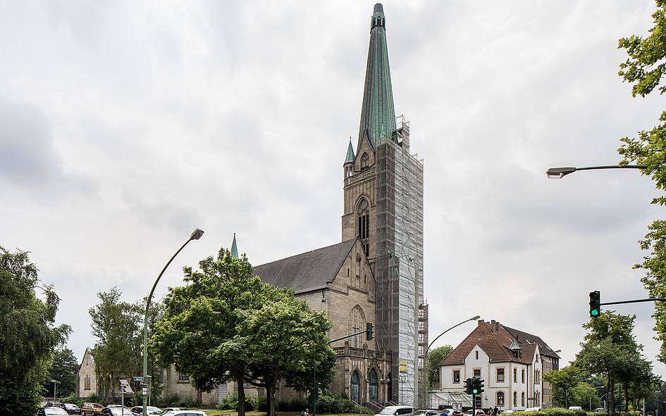 Seit einem Jahr ist die Sankt Hubertus Kirche in Bergerhausen eingerüstet. Vor vier Monaten hat sie endlich eine neue Spitze bekommen. Jetzt kommt das Gerüst weg - zumindest teilweise.