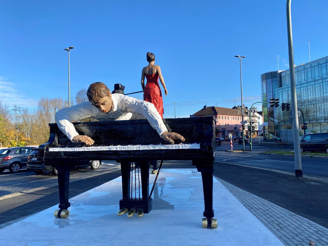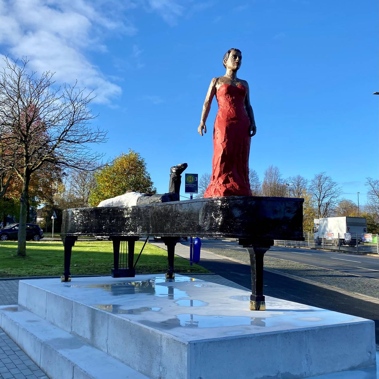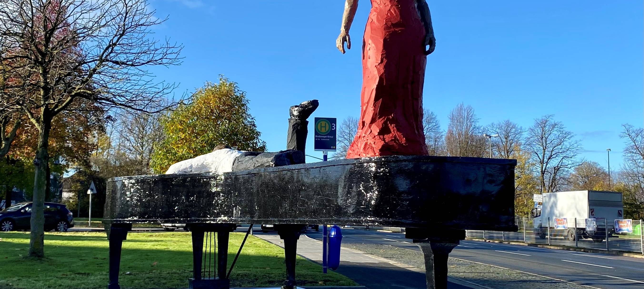 In unserer Stadt könnt Ihr ab sofort ein neues ziemlich auffälliges Kunstwerk bewundern. Am Bredeneyer Kreuz steht die Skulptur "Duett" des Bildhauers und Zeichners Stephan Balkenhol. Zu sehen ist ein Klavier mit zwei Menschen, eine Frau in einem roten Abendkleid steht auf dem Klavier und ein Mann liegt darauf und schaut auf die Tasten. Das Kunstwerk ist eine Spende der Nationalbank. Oberbürgermeister Thomas Kufen hat es am Wochenende gemeinsam mit dem Chef der Bank feierlich enthüllt. Die Essener Nationalbank engagiert sich schon lange für Kunst und Kultur, unter anderem unterstützt sie das Museum Folkwang und das Klavierfestival Ruhr.