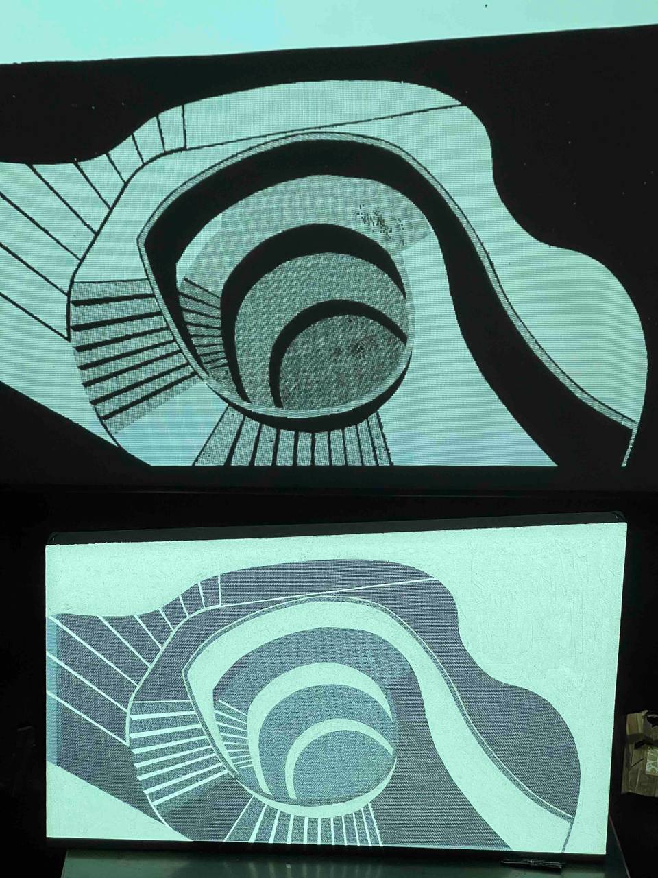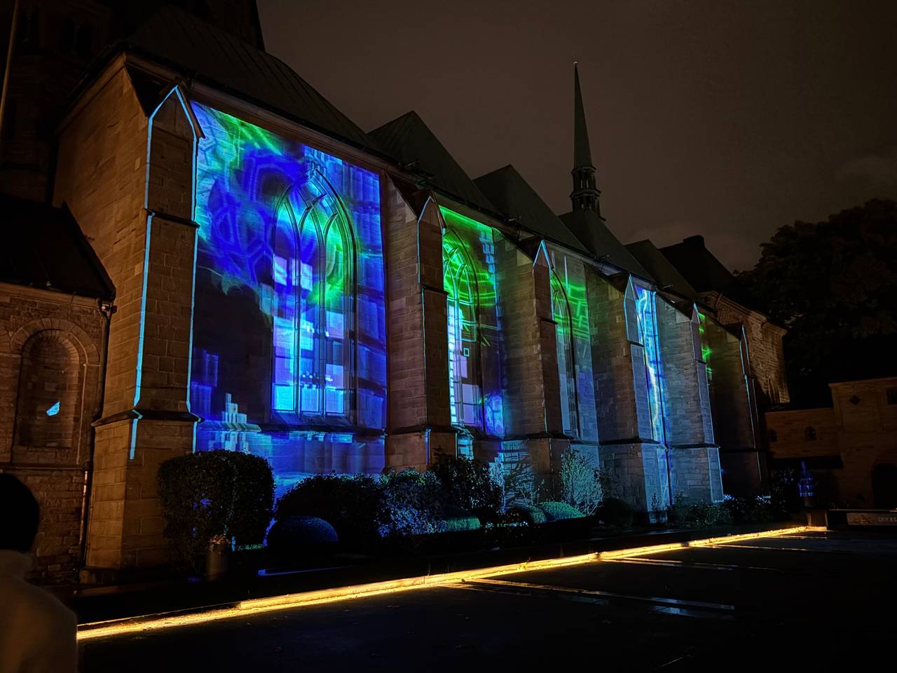Beim "Dom-O-Poly" am Essener Dom wird eine Technik benutzt, die Videomapping genannt wird. Das heißt Bilder und Videos werden wie ein Film auf eine Leinwand projiziert – nur dass die Leinwand hier der Dom ist. Das Video ist so angepasst, dass es genau auf die Formen und Details des Doms passt.