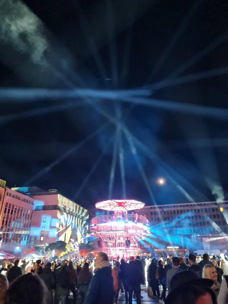 Zum zehnten Geburtstag gab es ein ganz besonderes Highlight beim Essen Light Festival. Zur Eröffnung am 02. Oktober hat der internationale Star DJ MOGUAI live auf dem Kennedyplatz aufgelegt. Ab 20 Uhr verwandelte er den großen Platz in der Innenstadt rund 90 Minuten lang in eine riesige Tanzfläche. Passend dazu wurden die Scheinwerfer und Projektoren live gesteuert. Auch für den Rest des Festivals wird der Kennedyplatz in Licht getaucht. Dafür werden mehrere hundert Scheinwerfer und Projektoren gebraucht - die größte Produktion bisher. Passend zu den Licht-Installationen am Kennedyplatz hatte MOGUAI auch ein 12-minütiges Musikstück produziert. Auch nach der Eröffnungsparty ging es noch weiter. Die EMG hat zur Aftershowparty in der Kulturkathedrale TRUDI am Viehhoferplatz eingeladen. Dort haben DJ MOGUAI sowie Star-DJ Salvatore Mancuso die Tanzfläche unterhalten.
