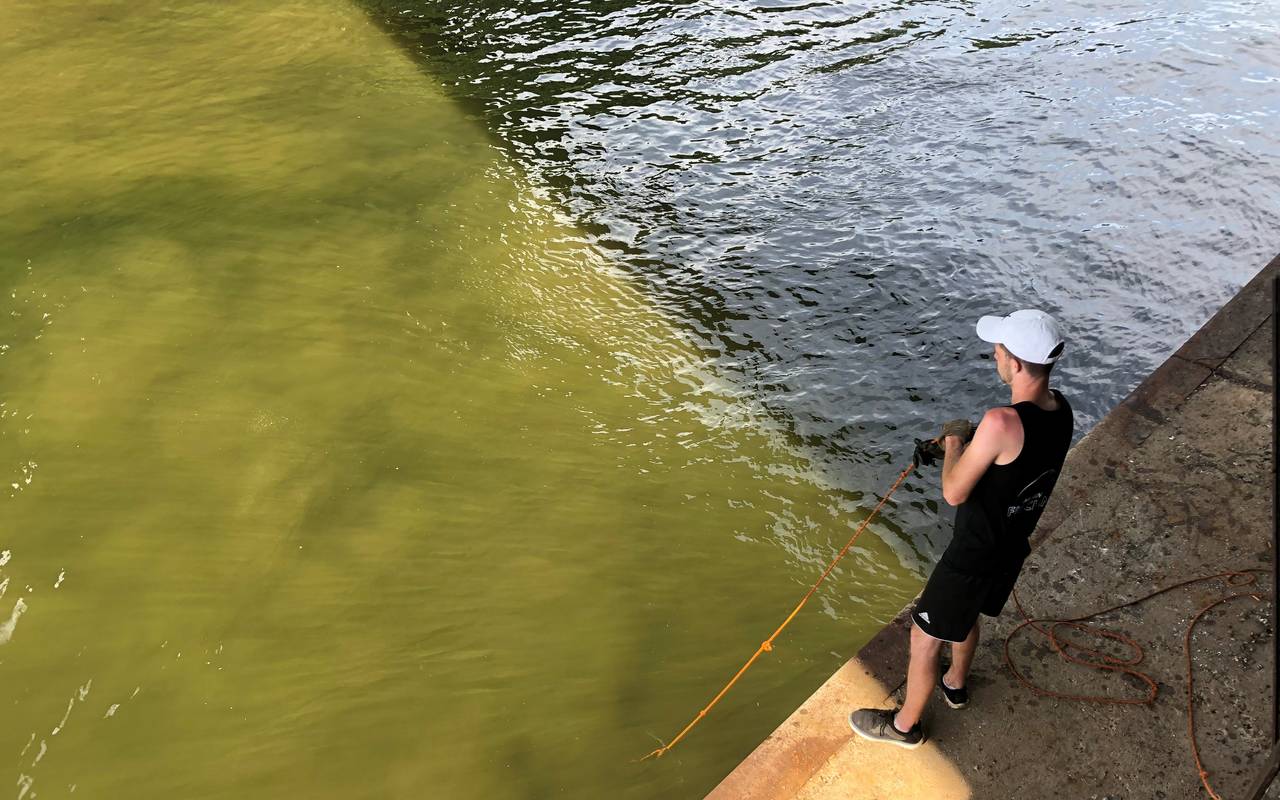 Ein Magnet hat sich unter einem Stein fest geklemmt und will einfach nicht raus. Wenn ziehen und ruckeln nichts hilft, muss einer ins Wasser und den Magneten raus holen. Der Kanal in Dellwig ist etwa drei bis vier Meter tief.