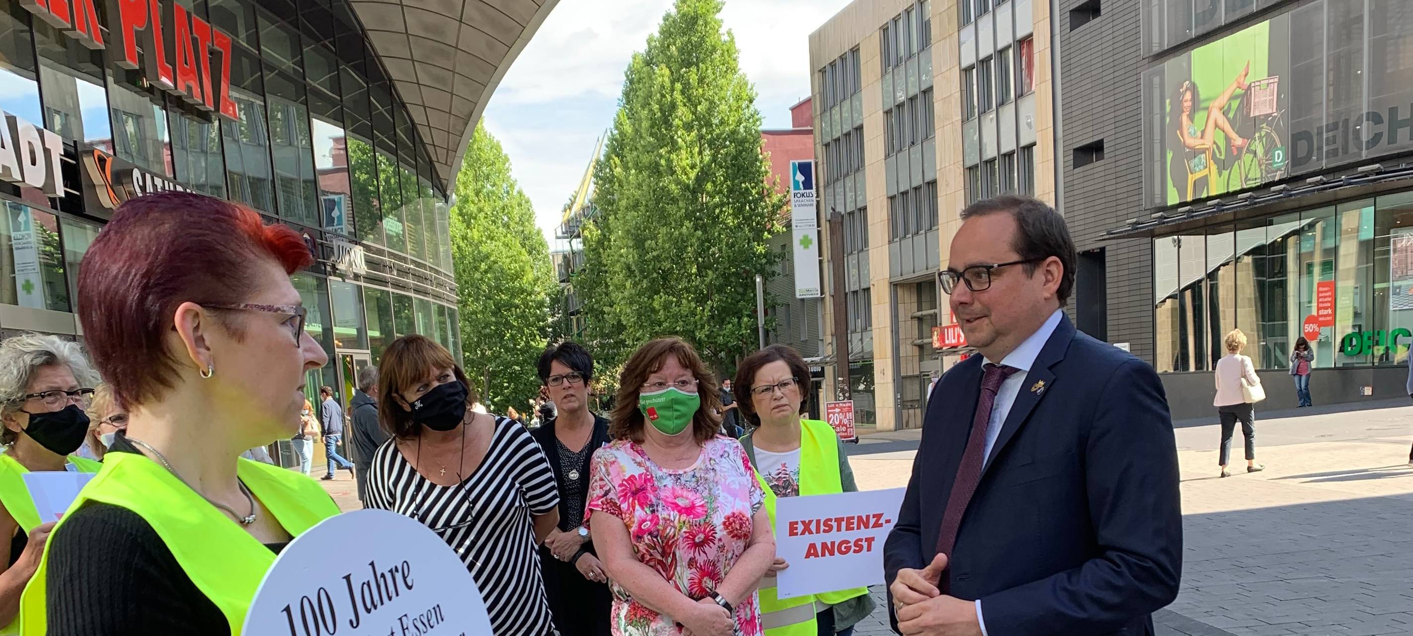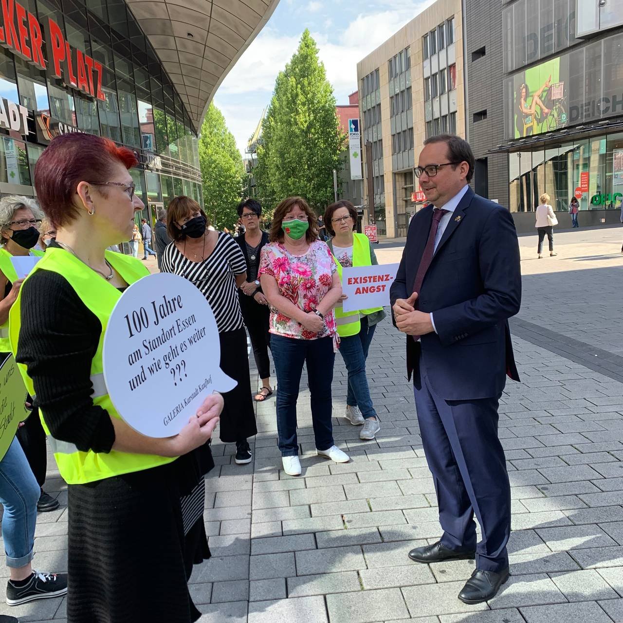 Heute (02. Juli, seit 10 Uhr) halten die Mitarbeiter von Galeria Karstadt Kaufhof eine Mahnwache am Limbecker Platz ab. Auch Oberbürgermeister Thomas Kufen ist gekommen. Es geht einmal mehr um den Erhalt der Warenhäuser bei uns in Essen.
