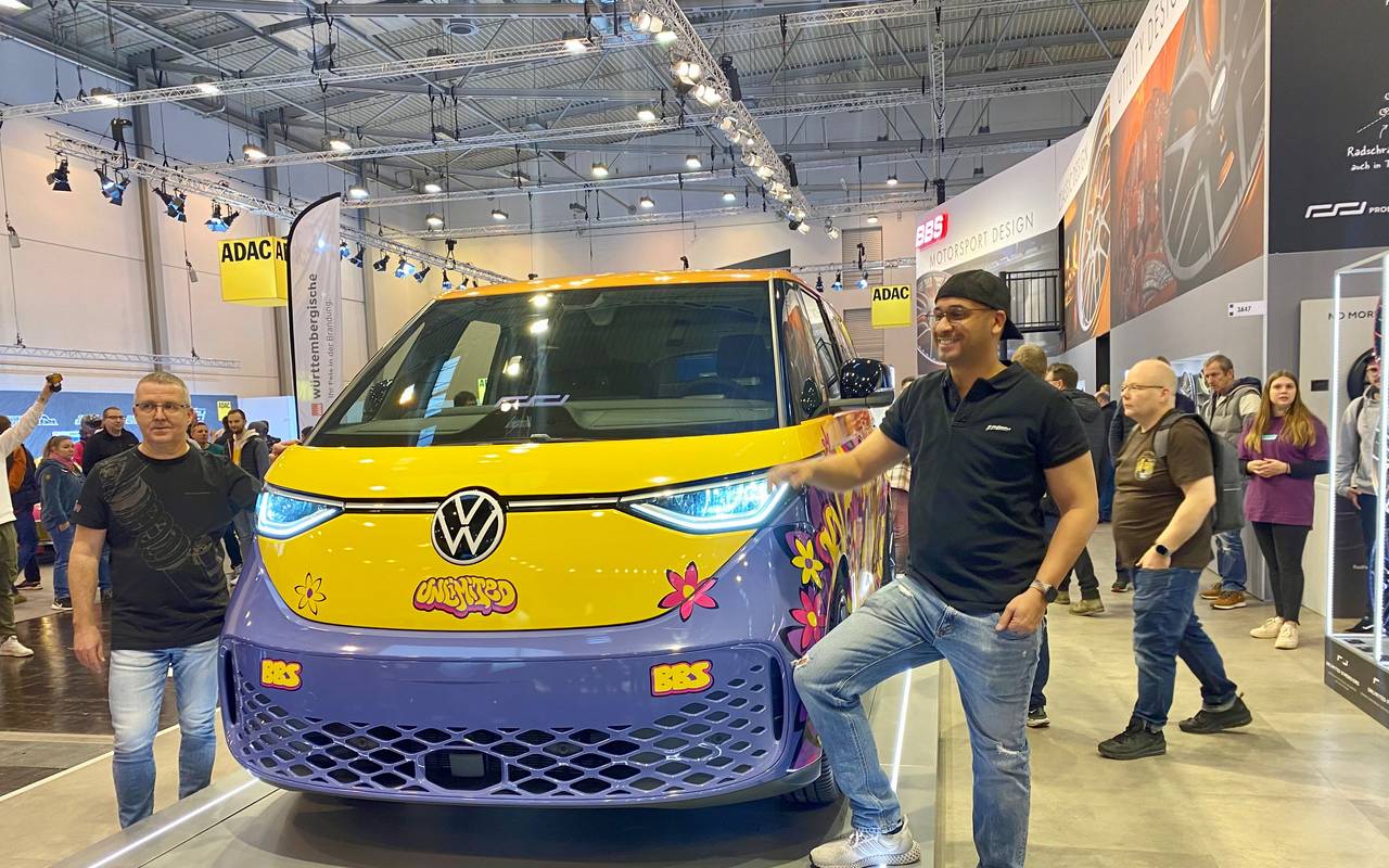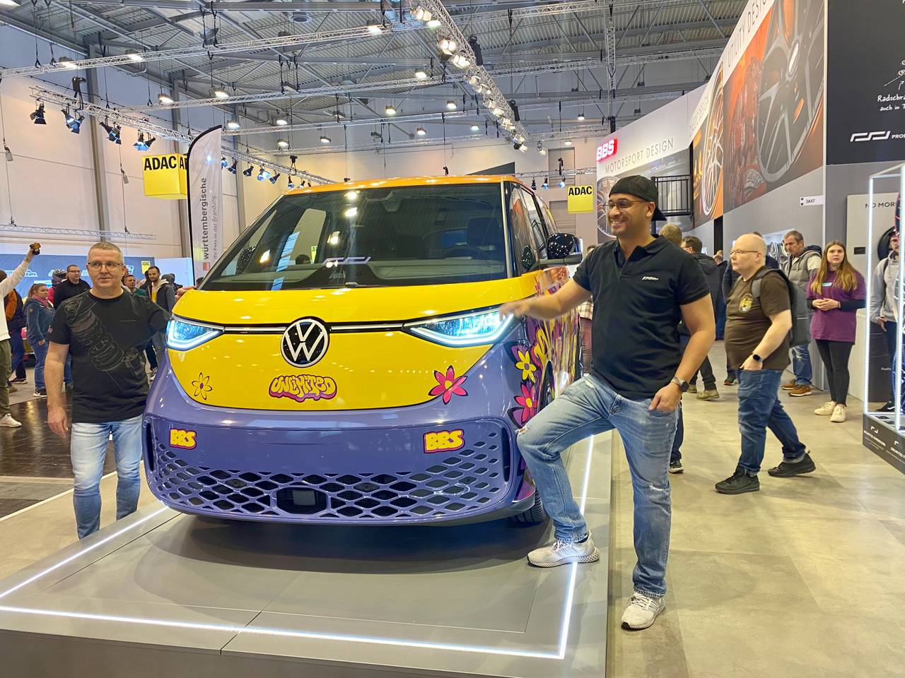 Es gibt verschiedene Highlights für alle Tuning-Fans in Essen. Unter anderem hat der Dortmunder TV-Moderator Jean Pierre „JP“ Kraemer von den PS-Profis einen getunten Bulli mit einem sehr starken Elektromotor vorgestellt. Der hat eine Flower Power-Lackierung.