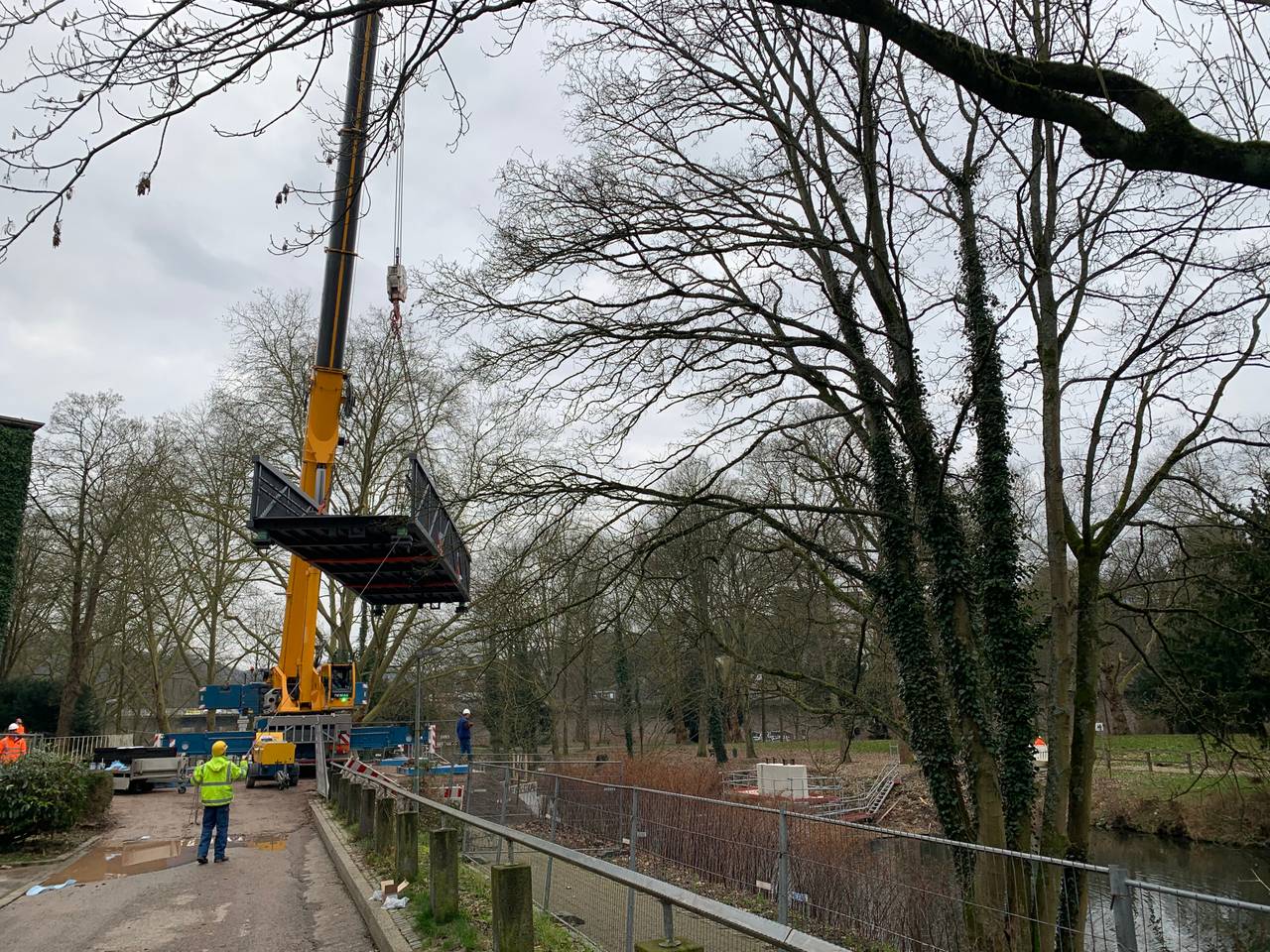 Auf der Brehminsel in Werden wird heute die neue Fußgängerbrücke montiert. Aktuell verbindet dort noch eine Holzbrücke die Joseph-Breuer-Straße mit der Brehminsel. Die alte Brücke ist aber inzwischen marode und seit Ende November sogar gesperrt. Anfang März soll die neue Fußgängerbrücke voraussichtlich eröffnen. Sie ist 13 Meter lang und 3 Meter breit. Bis zur Eröffnung bleibt die Brehminsel für die Öffentlichkeit gesperrt.
