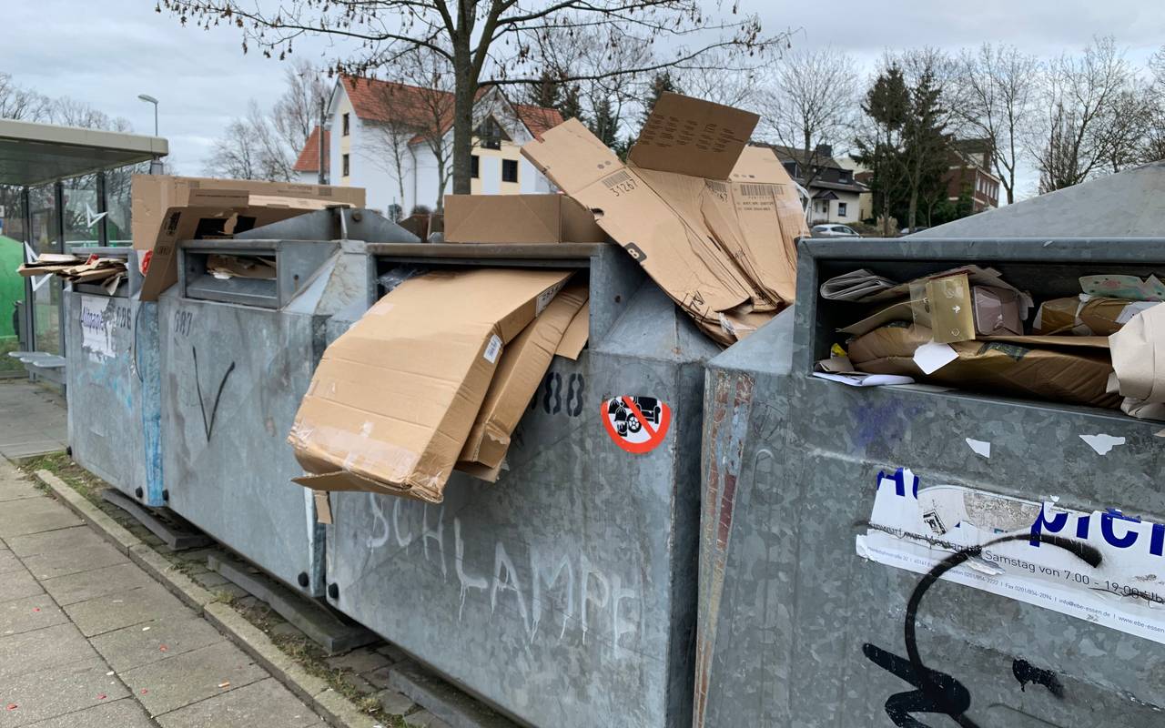 Nicht nur in Kupferdreh liegen alte Kartons auf dem Bürgersteig, feuchte Zeitungen pflastern den Asphalt, so sieht es in vielen Stadtteilen aus. Die Papiercontainer in Essen konnten etwa eine Woche lang nicht geleert werden, weil die Straßen glatt waren. Jetzt fährt die EBE Sonderschichten in allen Stadtteilen.