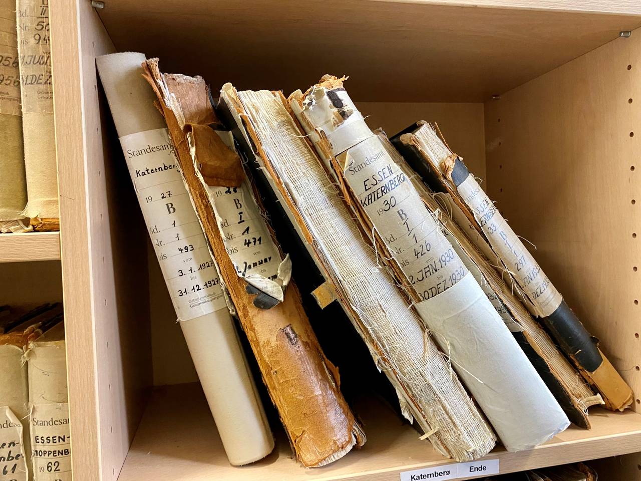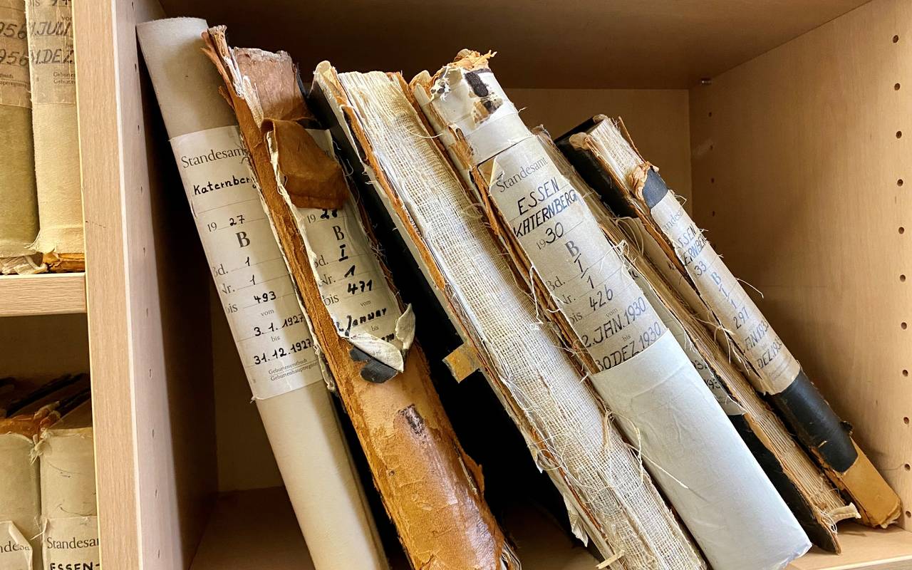 Das Archiv des Standesamtes bekommt normalerweise keiner zu sehen. Aber der Raum ist wichtig: In den Büchern stehen alle, die in Essen geboren wurden, hier geheiratet haben, oder hier gestorben sind. Das alte Archiv im Gildehofcenter hat die Sterbeurkunden der letzten 30 Jahre, die Eheurkunden der letzten 80 Jahre und die Geburtsurkunden der letzten 110 Jahre. Die ältesten Bücher sind sogar noch in Sütterlinschrift. So ein Archiv muss groß und ganz sicher sein. Es muss vor Einbruch, Feuer und Wasser geschützt sein.