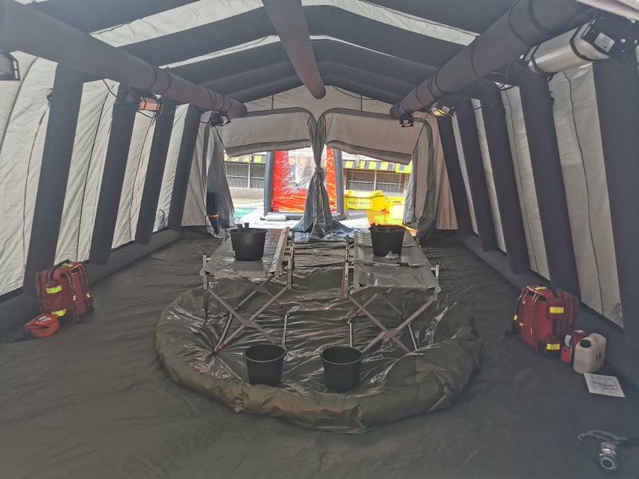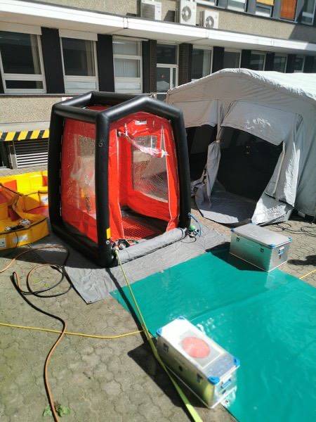 11:00 Uhr: Die vorbereitenden Maßnahmen vor Ort sind alle getroffen worden. Unter anderem sind eine Dekontaminierungsstrecke und Geräte zur Prüfung der Luftqualität aufgebaut worden. Die Delaborierung kann jeden Moment starten.