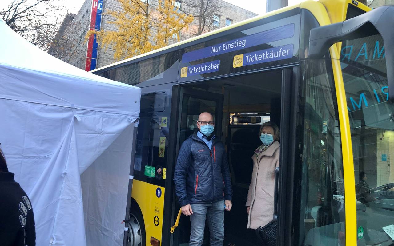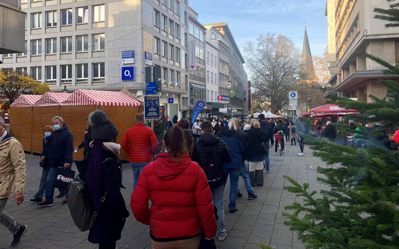 Vor dem Impfbus in der Innenstadt in Essen hat sich am Donnerstag-Nachmittag eine lange Schlange gebildet. Mehr als 500 Menschen warteten zeitweise auf eine Booster-Impfung.