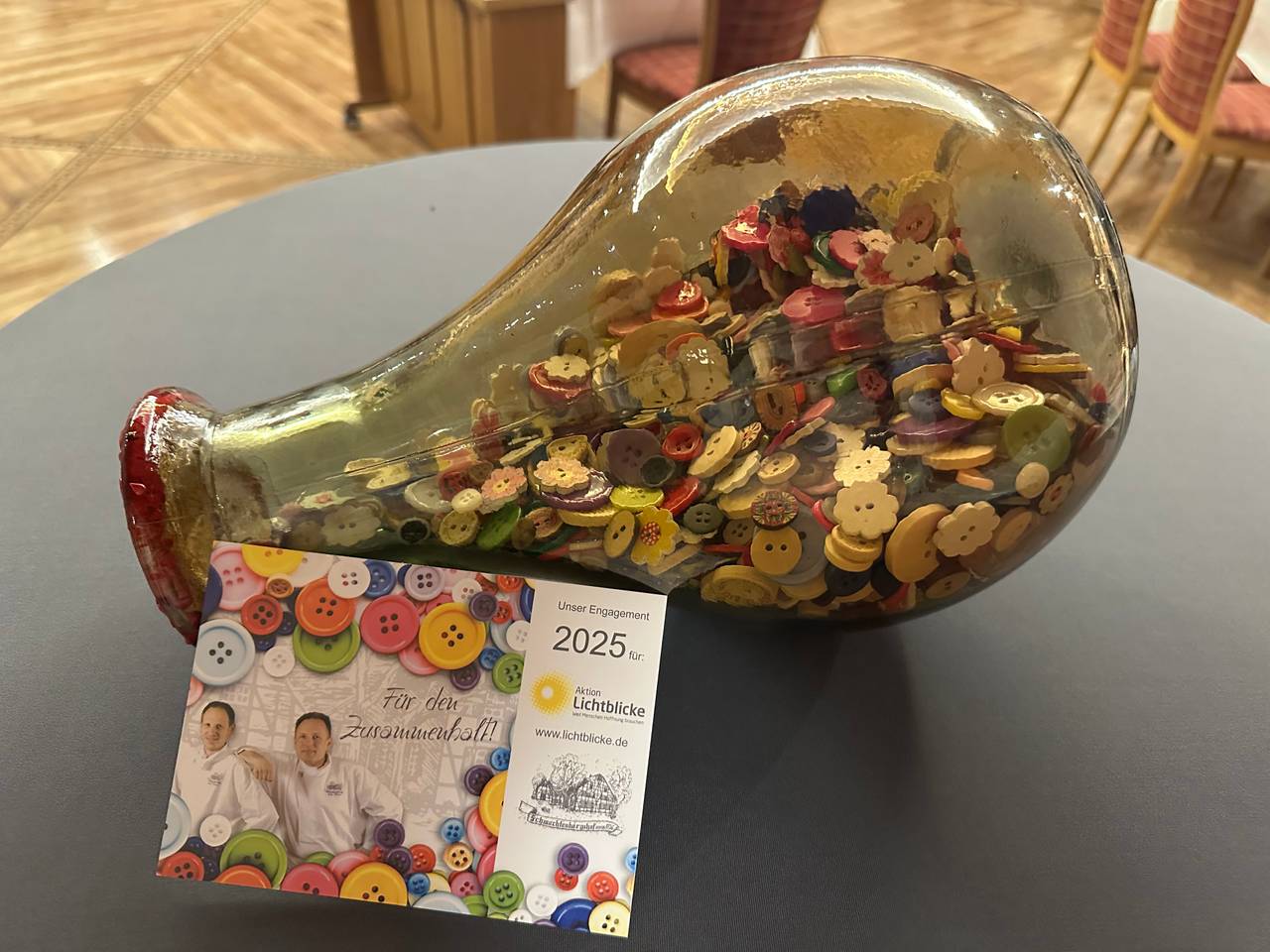 Im Hotel-Restaurant Schmachtenbergshof in Kettwig freuen sich die Gäste wieder über ein kleines Rätsel. Wenn sie ins Restaurant kommen, steht dort dieses Jahr wieder eine Flasche. Gefüllt haben die Brüder Jörg und Bernd Kaiser die Flasche dieses Jahr mit bunten Knöpfen. Die Gäste können einen Tippschein ausfüllen und schätzen, wie viele Knöpfe in der Flasche sind. Der Tipp kostet mindestens einen Euro und das Geld geht komplett an die Aktion Lichtblicke. Bis zum 25. Dezember können die Gäste rätseln und tippen. Danach werden die Knöpfe von den beiden Brüdern gezählt und die Tippscheine ausgewertet. Wer am nächsten dran ist, kann ich über Gutscheine für das Restaurant im Schmachtenbergshof und über Präsente freuen. Die Brüder Kaiser sind schon seit 12 Jahren dabei und füllen die Flasche jedes Jahr mit anderen Dingen. Im letzten Jahr zum Beispiel waren es 1859 Kronkorken und 2600 Euro für die Aktion Lichtblicke.