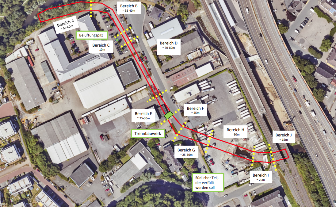 Die Stadt Essen will den Zugang zum alten Deilbach-Gewölbe in Zukunft mit Ketten versperren. So können die Fledermäuse noch hindurchfliegen, Unbefugte sollen aber nicht in das Gewölbe klettern können. Das Gewölbe fließt auch immer wieder voll Wasser und dort leben Fische. Die werden jetzt von der Fischerei abgefischt. Dann starten zunächst Bauarbeiten für die Trennwand. Dazu wird auch die Straße geöffnet. Um die Fledermäuse nicht zu stören, wird auch noch eine Plane angebracht, die sie vor dem Staub und Schmutz durch die Bauarbeiten abschirmt. Für die Belüftung des verbleibenden Teilstück des Gewölbes wird ein 1,50 Meter hoher Belüftungspilz aufgestellt. Sobald die Trennwand fertig ist, wird das Wasser aus dem südlichen Teil des Gewölbes abgepumpt und der alte Bachlauf wird komplett verfüllt. Danach wird bei der Spedition auch die Oberfläche wiederhergestellt. Die Arbeiten sollen bis Ende des Jahres dauern.