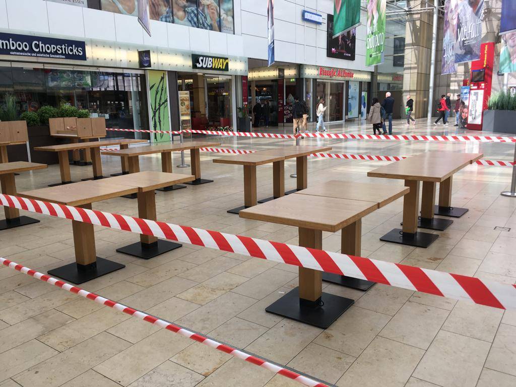 Noch ist aber nicht alles geschlossen in Essen. Unser Stadtreporter hat auch einige Ecken entdeckt, die offen haben, aber fast vergeblich auf Kunden warten. So sieht es aktuell bei den Einkaufszentren in Essen auf. Der Limbecker Platz hat zum Beispiel noch offen, aber mit Einschränkung. 700 Menschen dürfen gleichzeitig hinein. Viele Geschäfte und Cafés haben dort noch auf, aber unser Stadtreporter hat gesagt, viele Verkäufer stehen sich die Beine in den Bauch, es kamen den ganzen Tag kaum Kunden. Ein paar Besucher haben sich einen Saft oder Eis in den Cafés geholt, aber alles to-go. An den Tischen darf keiner mehr sitzen. Die sind in der Rathausgalerie zum Beispiel auch mit Absperrband umzäunt.