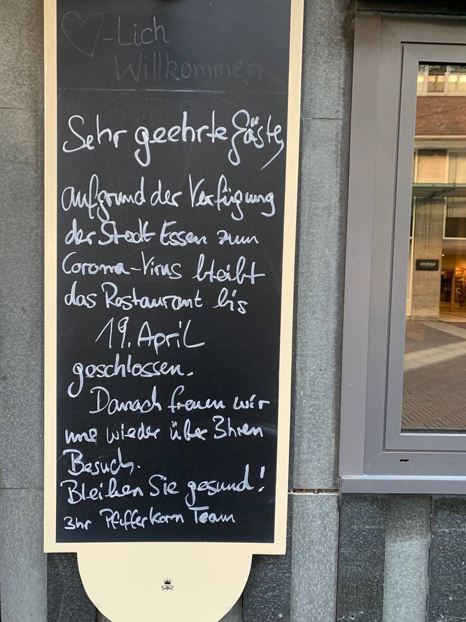 Das liegt aber auch daran, dass vieles eben geschlossen hat. An Freizeitaktivitäten ist nicht mehr viel zu unternehmen draußen. Auch viele Restaurants und Cafés haben zu. Zum Beispiel am Kennedyplatz die Bar Celona oder das Extrablatt, aber auch weiter Richtung Hauptbahnhof hängen Schilder an den Restaurants, wie dem Pfefferkorn. Die sagen: Aufgrund der aktuellen Lage geschlossen! An der Rüttenscheider Straße sah es am Morgen etwas anders aus. Da waren viele Cafés geöffnet und viele Essener saßen draußen beim Frühstück, drinnen saß allerdings kaum jemand.