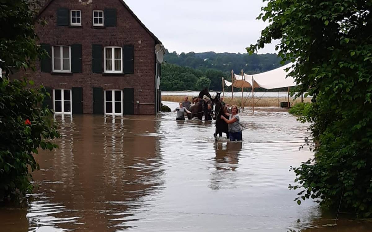 Das Hochwasser in Essen hat nicht nur bei vielen Menschen in Essen für einen Schock gesorgt. Auch die Pferde auf dem Altenbroichshof in Kettwig mussten vor den Überschwemmungen gerettet werden. Innerhalb von knapp zwei Stunden stand der komplette Hof unter Wasser. Auch die Ställe waren nicht vor den Wassermassen sicher. Die beiden Besitzer Wolfgang und Andrea Berns mussten ihre insgesamt 28 Pferde aus dem Stall holen und in einer Kolone durch das Wasser führen. Umliegende Höfe haben sie erst einmal aufgenommen.