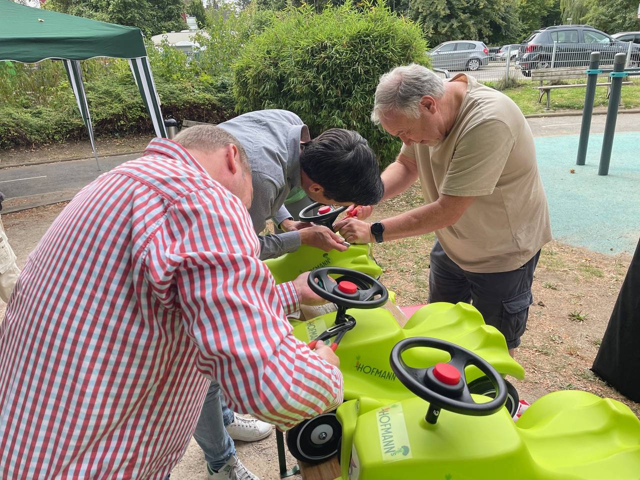 Der Aufbau für den Weltrekordversuch startet schon einen Tag früher, denn es gibt nicht nur das Rennen, sondern auch das längste Spielplatzfest in Deutschland. Praktisch neben der Rennstrecke wird ebenfalls vier Tage lang mit Hüpfburgen und Co. gefeiert. Auch ein Bierwagen und ein Grill werden aufgebaut und sogar Live-Musik soll es geben. Erstmal sind Christian Westerhoff und seine Helfer damit beschäftigt die zehn neuen Bobbycars zusammenzubauen. Sie werden die nächsten Tage ihre Runden auf der Strecke neben dem Bolzplatz drehen. Nach jedem Rennen wird die Zeit des Gewinners notiert. Nach den vier Tagen werden dann alle Zeiten addiert. Einer der Fahrer ist immer einer der Spielplatzpaten. Damit die das körperlich schaffen, wurden sogar Physiotherapeuten engagiert. Davon erzählt Christian Westerhoff im Interview mit Radio Essen-Stadtreporter Timm Schröder.
