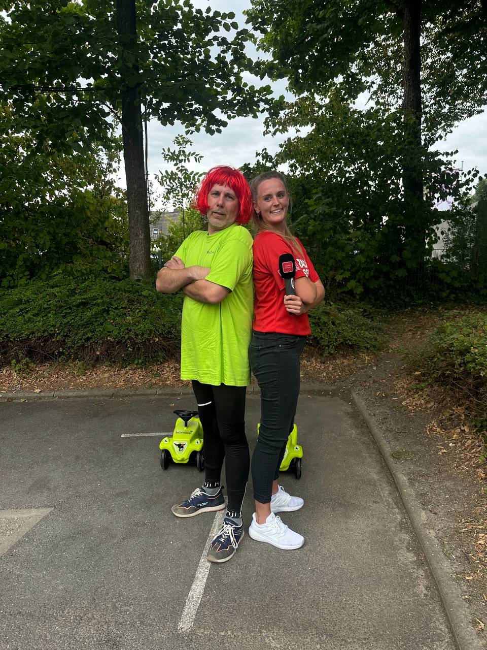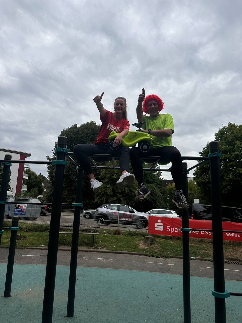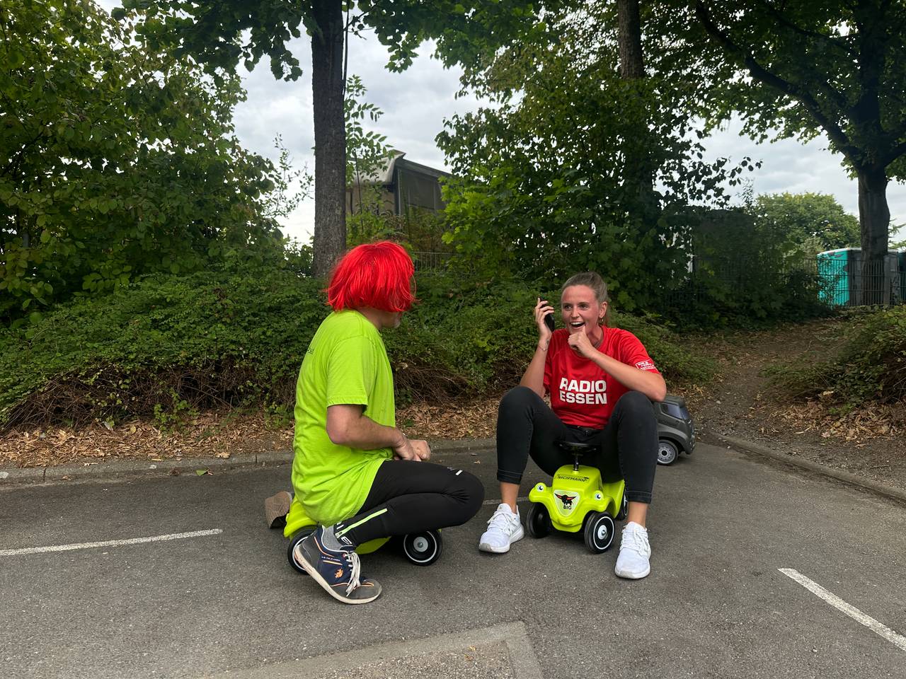 Eine Challenge lassen wir uns von Radio Essen nicht entgehen – schon gar nicht, wenn sie auch noch dem guten Zweck dient! Frühschicht-Moderatorin Julia Crüsemann trat gegen Herausforderer Micha aus Überruhr an. Austragungsort: der Spielplatz am Eskenshof. Micha stürmte in roter Perücke und grellgrünem Teamshirt an die Startlinie. Julia stand ihm im roten Radio Essen Trikot entschlossen gegenüber. Der Startschuss fiel – und beide schossen nach vorne! Zuerst jagten sie durch die langgezogene Rechtskurve, dann führte die Strecke zwischen den Bäumen hindurch. Der Anstieg hat beiden etwas den Atem geraubt, doch keiner von beiden ließ locker. Noch eine scharfe Rechtskurve – und dann der Endspurt auf der Zielgeraden. Jede Sekunde blieb es spannend. Doch schließlich setzte Julia zum entscheidenden Sprint an und holte den Sieg für Radio Essen!