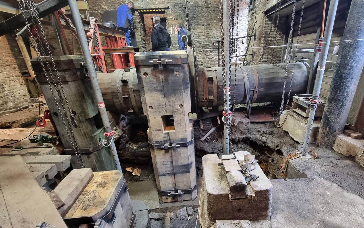Im Hammergebäude sind die Arbeiten aber gut voran gekommen. Dort sind die großen tonnenscheren Hammergerüste inzwischen eingebaut, die schweren Holzhämmer sind ebenfalls drin. Jetzt muss getestet werden, ob alle Teile richtig miteinander funktionieren. Dann kann voraussichtlich im Mai ein richtiger Probelauf starten.