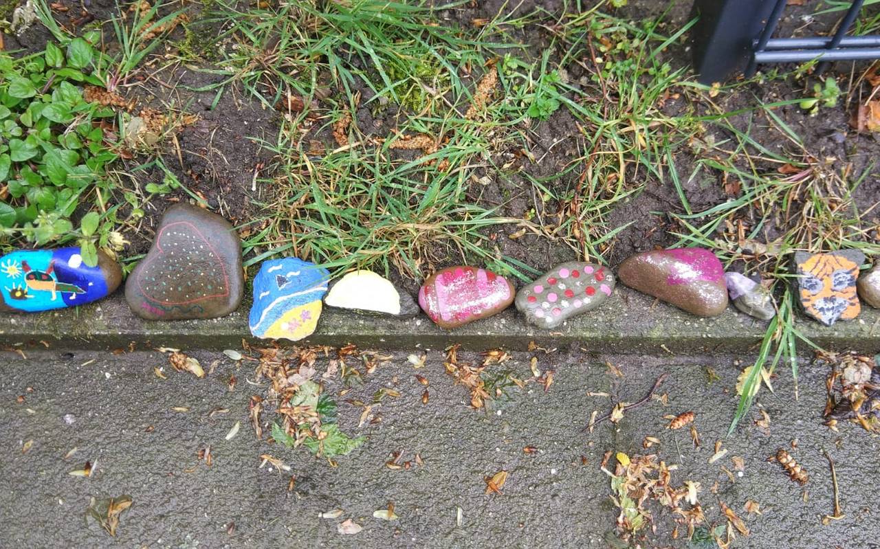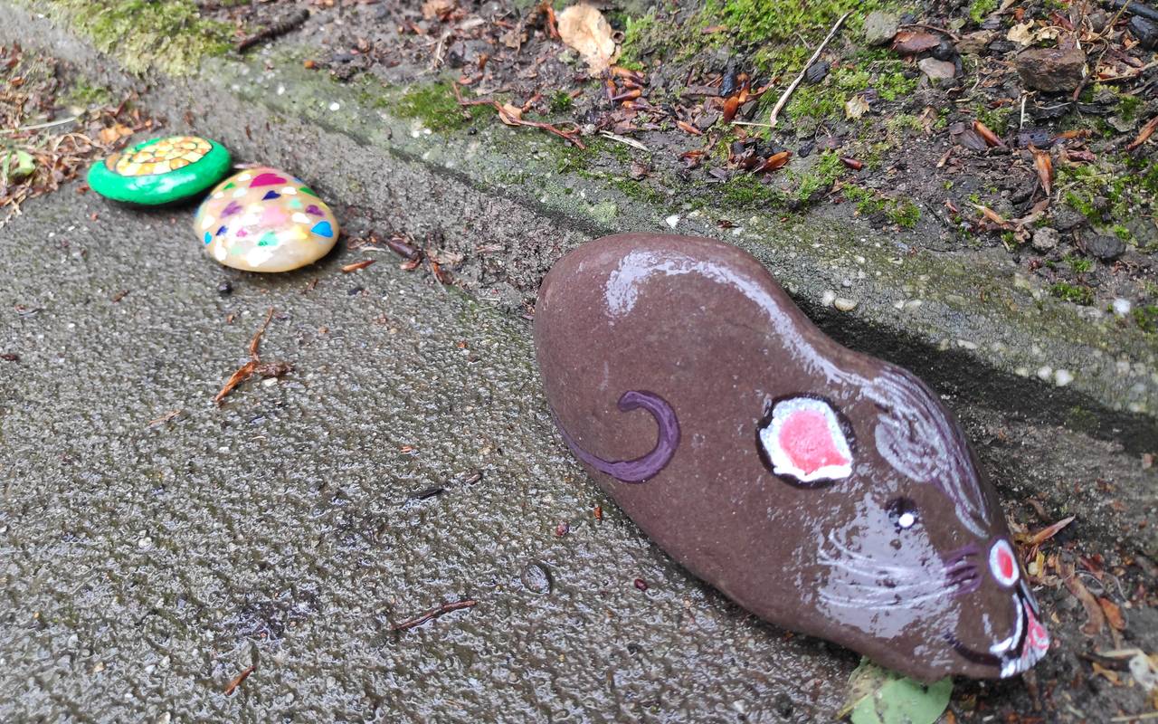 Mittlerweile liegen direkt vor der "Flohkiste" schon wieder drei bemalte Steine: Einer mit einer Schnecke drauf, einer mit Herzchen und einer, der aussieht, wie eine Maus. Ein Ersatz für die geklauten Steine sind die aber nicht.