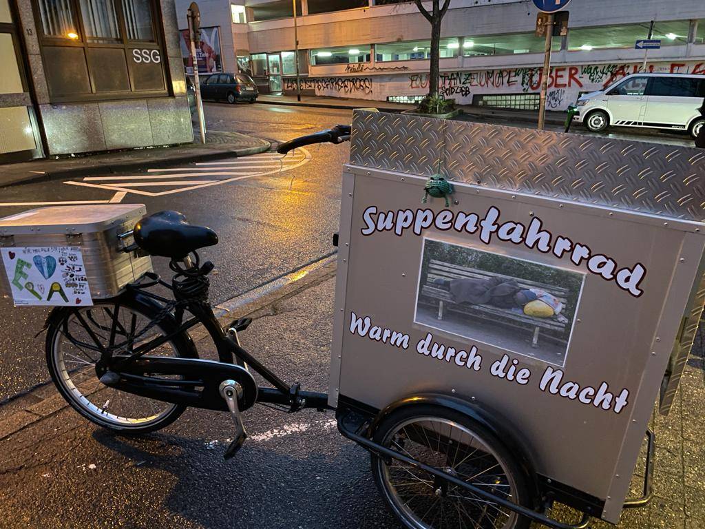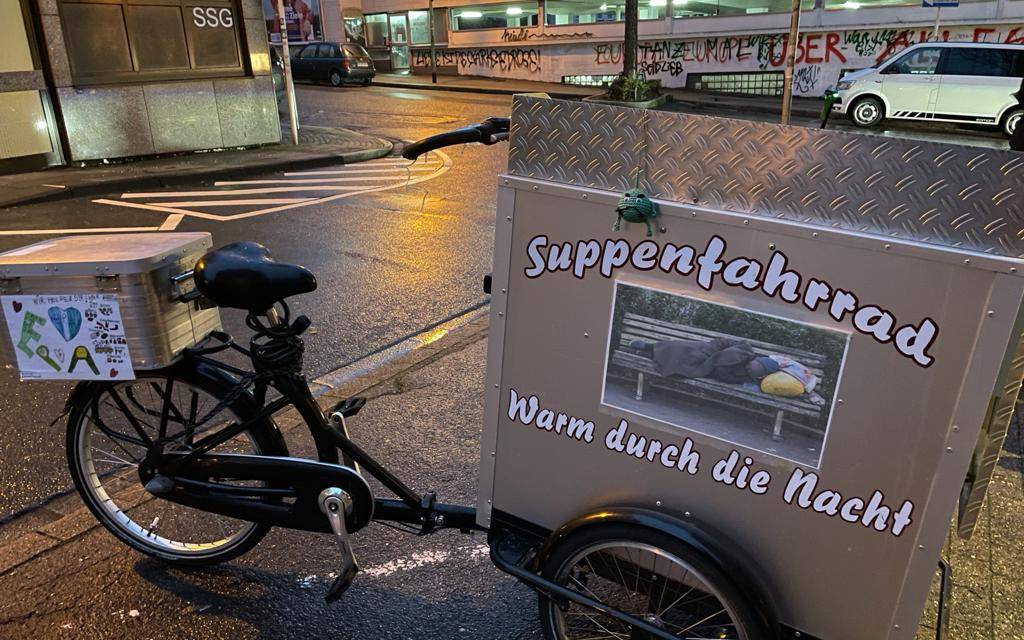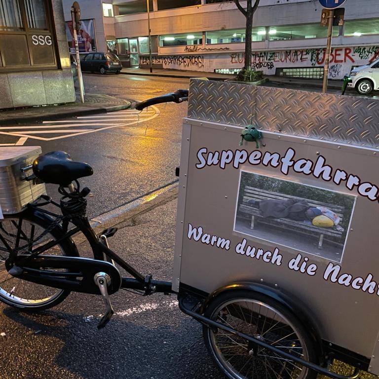 Beim Suppenfahrrad kann jeder helfen. Jeden Dienstag und Samstag sind die Freiwilligen von Essen Packt An unterwegs. Wer mitmachen möchte, kann sich einfach in der Facebook-Gruppe von Essen packt an! melden.