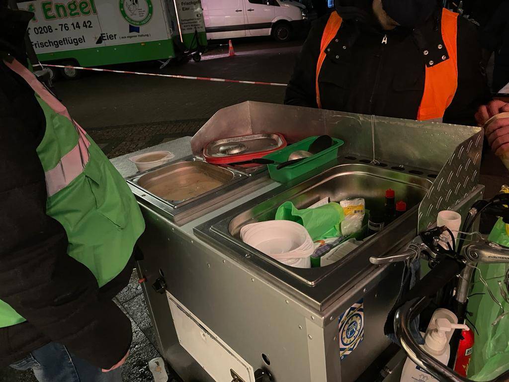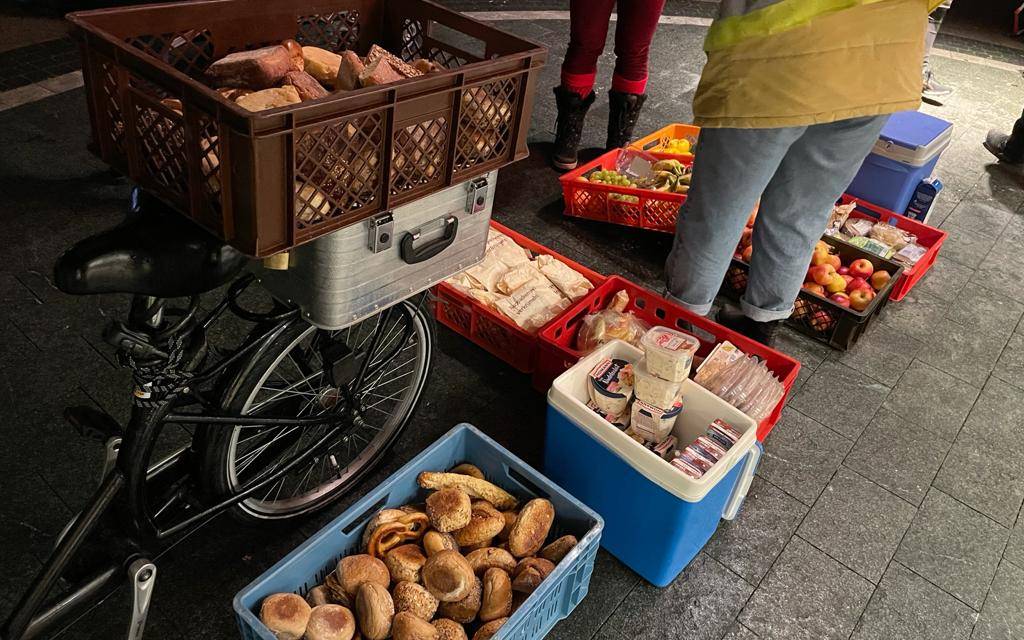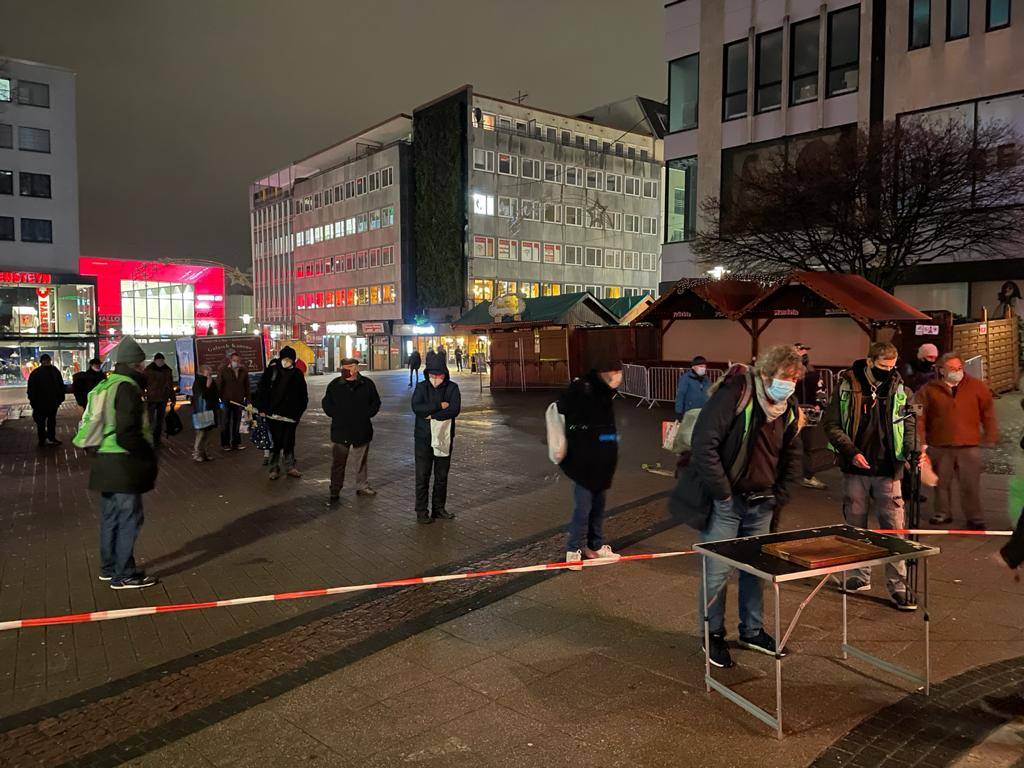 Die Aktion "Warm durch die Nacht" startet um 17 Uhr an einer Garage in der Nähe des Kopstadtplatz in der Innenstadt. Dort werden Brötchen in Tüten gepackt, Kaffee gekocht und das Suppenfahrrad befüllt. Von dort aus geht es zur Marktkirche. Etwa 30 Obdachlose warten sehnsüchtig auf die etwa 15 ehrenamtlichen Helfer:innen von Essen packt an. Sie halten Abstand, tragen Maske und stehen in geordneten Reihen vor der Essensvergabe, die die Helfer:innen aufbauen. "Es sind etwas weniger Menschen als sonst, weil viele im Winter schon früh ihre Schlafplätze suchen", erklärt David, der die Aktion mit organisiert. Jeden Dienstag und Samstag stehen die Ehrenamtlichen in der Innenstadt und verteilen Essen an diejenigen, die keins haben. Ibrahim ist einer von ihnen und kommt seit etwa einem Jahr zur Essensausgabe: "Kostenlos schmeckt immer gut", erklärt er mit einem Grinsen auf dem Gesicht. Aber es ist mehr als das. Die Obdachlosen sind dankbar für die Hilfe, die sie bekommen. Ohne die ehrenamtlichen Helfer:innen würde ihr Magen vielleicht sogar leer bleiben.