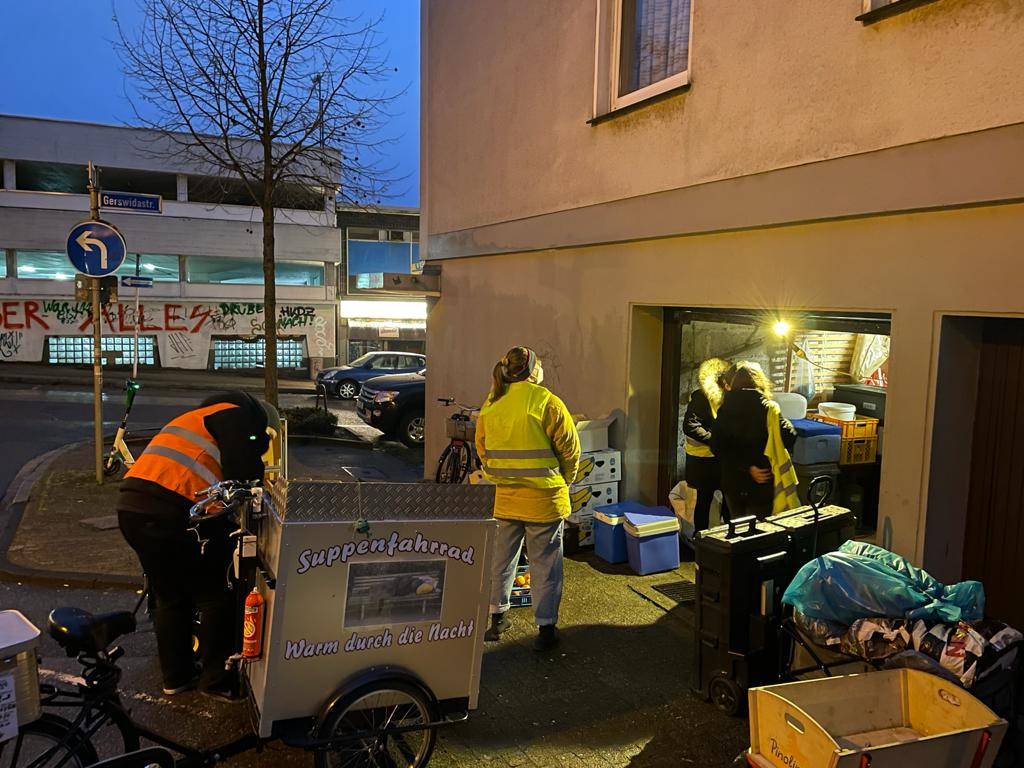 "Hey. Grüß dich - wie geht es dir", fragt David eine ältere Frau, die sich ebenfalls eine warme Suppe holen möchte. Die ehrenamtlichen Helfer:innen kennen die Obdachlosen - viele kommen seit längerer Zeit zur Essensvergabe. Die Frau hat trotz der Temperaturen knapp über dem Gefrierpunkt keinen Schal und keine Mütze an. Ein Ehrenamtlichen machen sich sofort auf den Weg zur Garage und besorgt von dort wärmere Anziehsachen. Auch untereinander helfen sich die Obdachlosen in der Stadt. Einige von ihnen bezeichnen sich selbst als "kleine Familie".