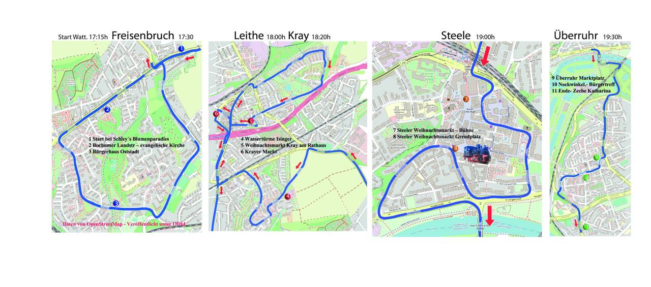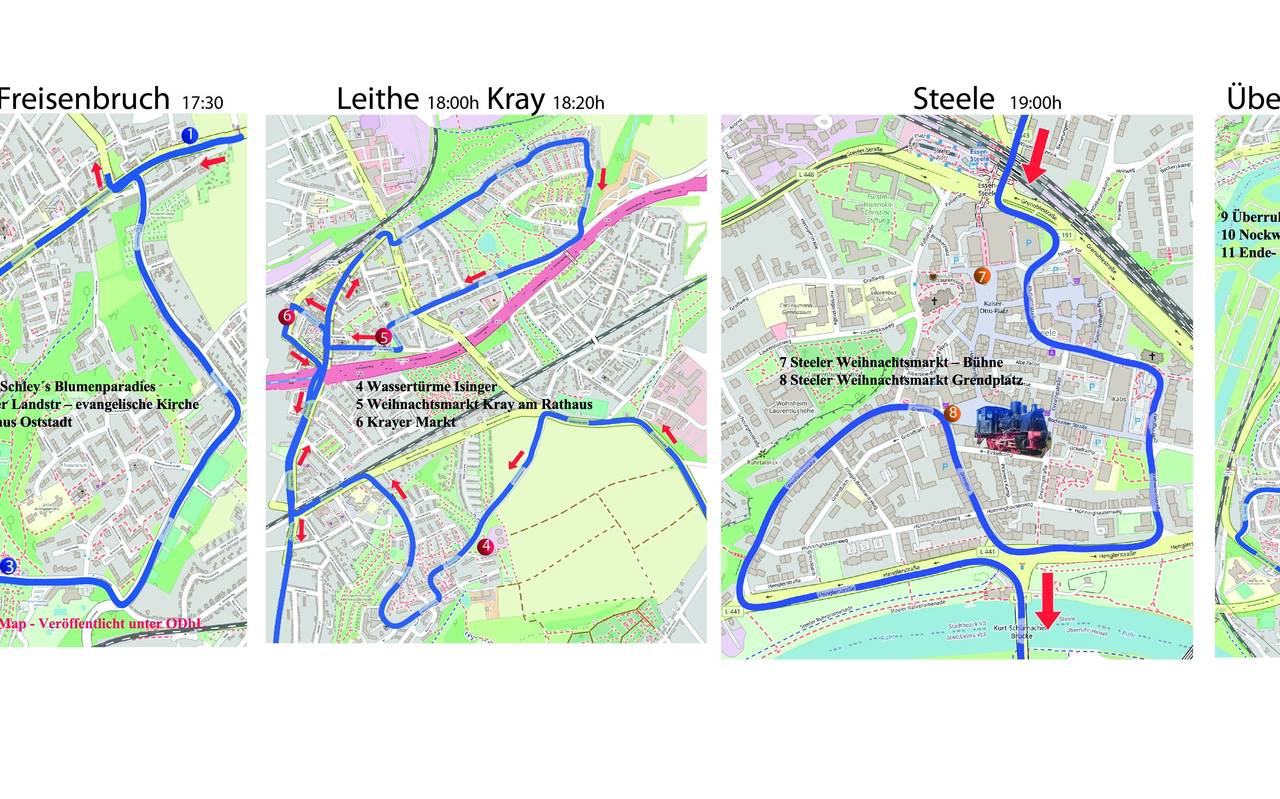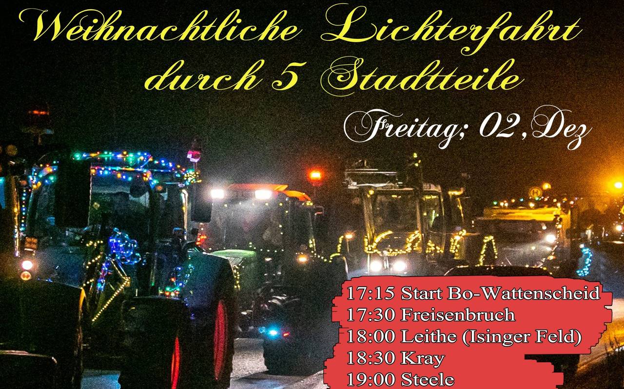 Rund 50 weihnachtlich geschmückte Traktoren sind am Freitagabend (2. Dezember) durch Freisenbruch, Leithe, Kray, Steele und Überruhr unterwegs. Mit der Aktion wollen die Landwirte der Kreisbauernschaft Ruhrgroßstädte weihnachtliche Stimmung verbreiten und gleichzeitig sammeln alle Beteiligten zusammen mit dem Verein Bulldogs for Kids Spenden für Dialyse-, Leber- und Nierentransplantationsstation der Kinderklinik an der Uniklinik in Holsterhausen und die Aktion Lichtblicke. Die Landwirte zahlen für die Teilnahme an der Rundfahrt und die Werbegemeinschaften aus Kray, Freisenbruch, Steele und die Überruhrer Bürgerschaft spenden ebenfalls. Die Idee für die Aktion kommt von der Werbegemeinschaft Kray und wird von den Werbegemeinschaften Freisenbruch und Steele und der Überruhrer Bürgerschaft unterstützt.