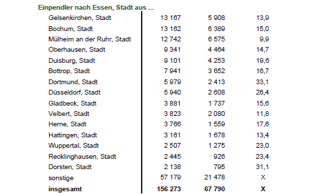 Die Zahl der Berufspendler bei uns in Essen steigt weiter deutlich an. 156.000 Menschen kommen täglich zum Arbeiten zu uns in die Stadt, 106.000 fahren zum Arbeiten aus Essen raus in andere Städte.