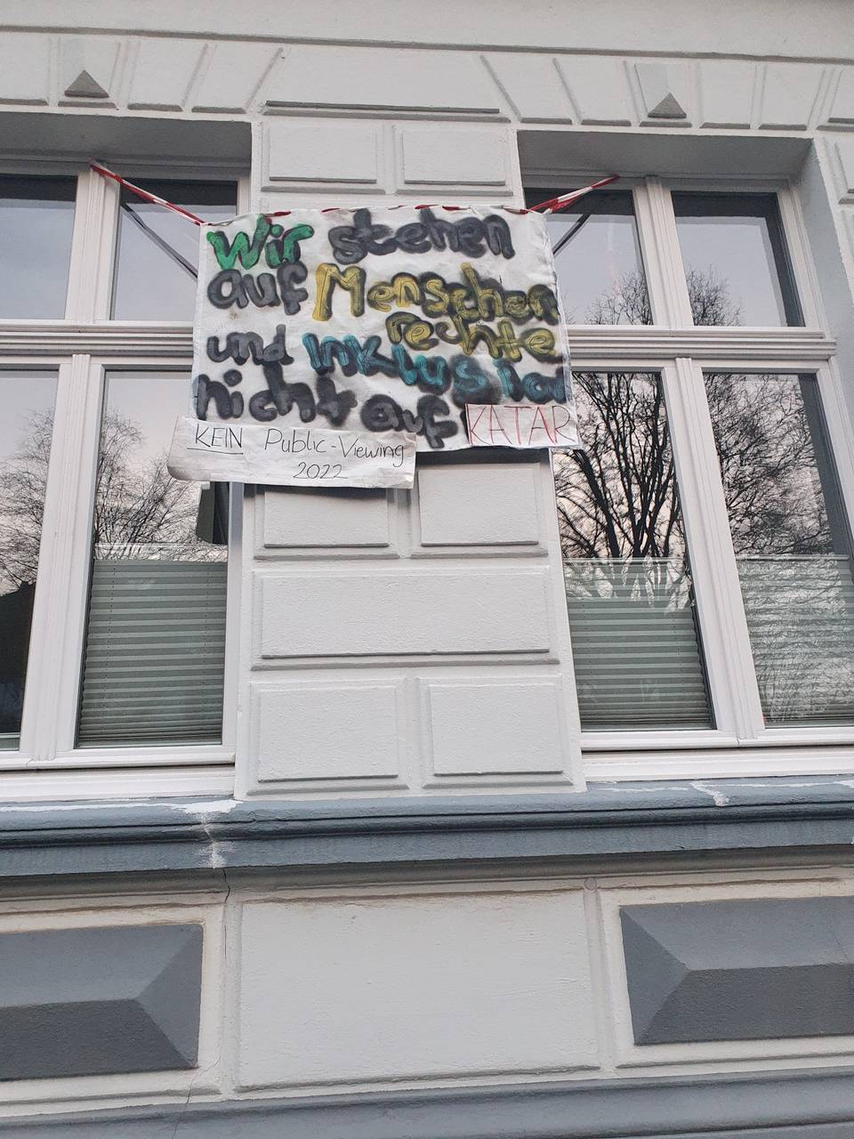 Um seine Sichtweise auszudrücken, hat Max ein Plakat gestaltet, welches jetzt am Wohnheim hängt. Darauf zu lesen: “Wir stehen auf Menschenrechte und Inklusion, nicht auf Katar – kein Public Viewing 2022."