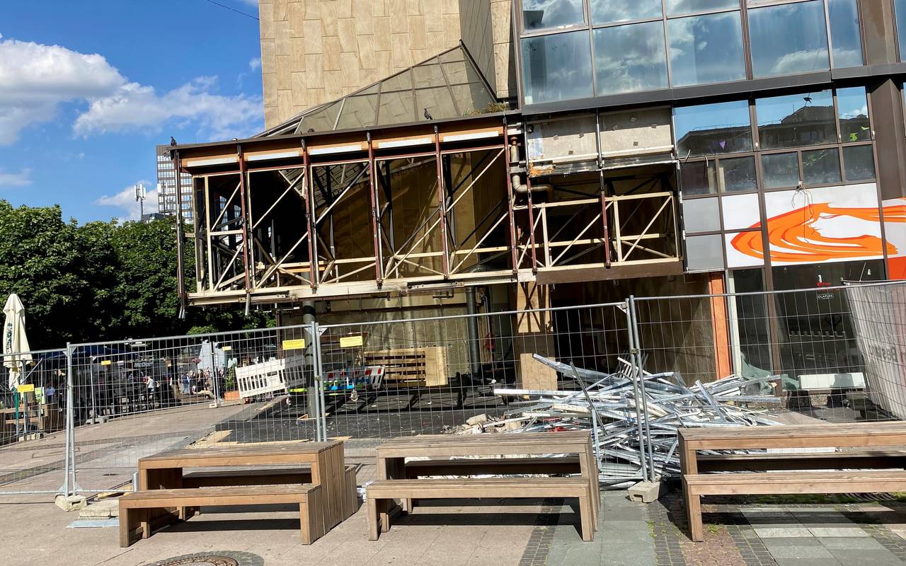 Am Essener Kennedyplatz wird aktuell die Bar Sausalitos umgebaut. Hinter dem Bauzaun ist nur noch ein Gerippe aus Stahl. Die Wiedereröffnung im Frühling geplant.