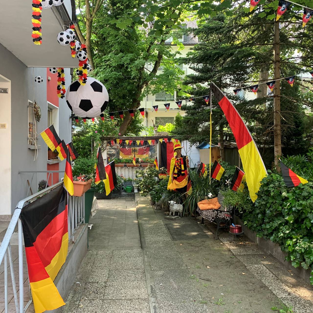 Es sind zwar keine großen Public Viewings erlaubt - aber dafür sorgt Achim Klimmeck aus Altendorf gerade für jede Menge Deutschland-Flair vor seiner Haustür. Bei dem Anblick kommt man sofort in Fußballstimmung: Hunderte Flaggen von Deutschland und anderen Fußball-Nationen sind zwischen den Häusern über die Straße gespannt.