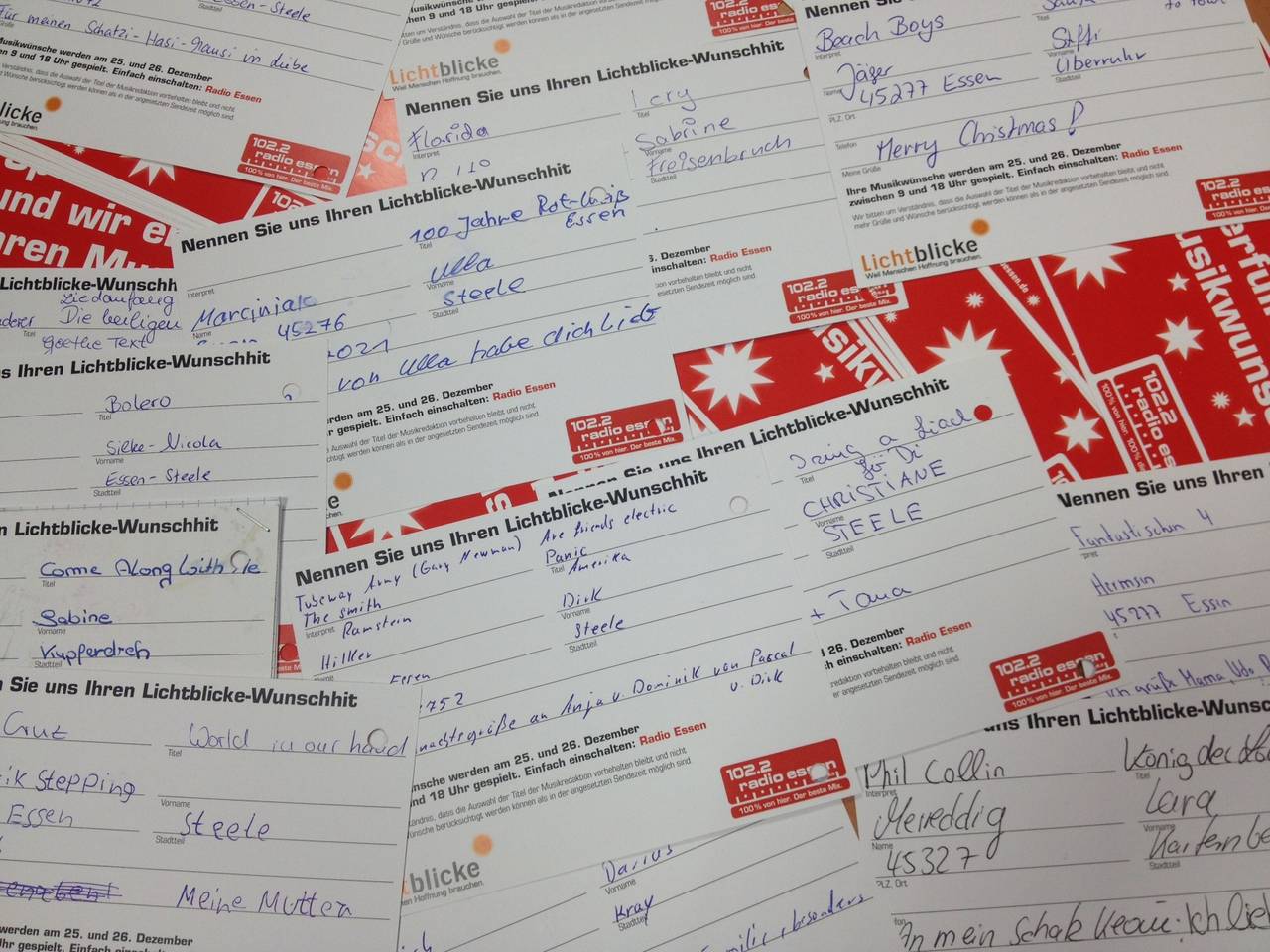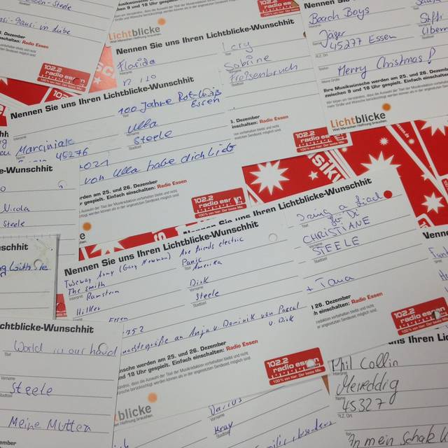 Wenn eines bei Radio Essen Tradition hat, dann sind es Eure Musikwünsche an den Weihnachtsfeiertagen. Wir haben am 1. und 2. Weihnachtsfeiertag Eure Musikwünsche gespielt - fast 300 verschiedene Titel! -, die Ihr Euch auf unserer Lichtblicke-Weihnachtsmarkt-Tour gewünscht habt. Wann Euer Song mit Eurem Gruß dran war, seht Ihr hier in der Stunden-Übersicht. Besonderheit: Am 25.12. ab 18 Uhr haben wir nur deutschsprachige Songs gespielt, von Rap über Deutschpop bis Schlager.