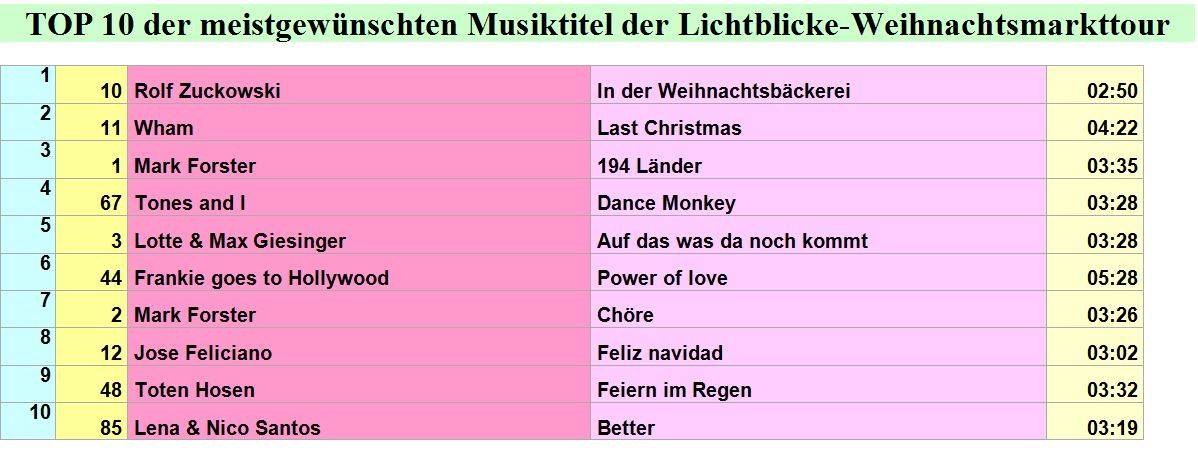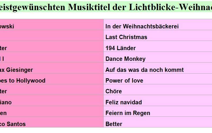 Wir sagen DANKE! Ihr habt uns mit Euren Lichtblicke-Wunschhits die Weihnachtsfeiertage verschönert. Deshalb spielen wir Eure meist gewünschten Lieder noch einmal am 27. Dezember zwischen 14 und 16 Uhr. Das war Eure Top 10.