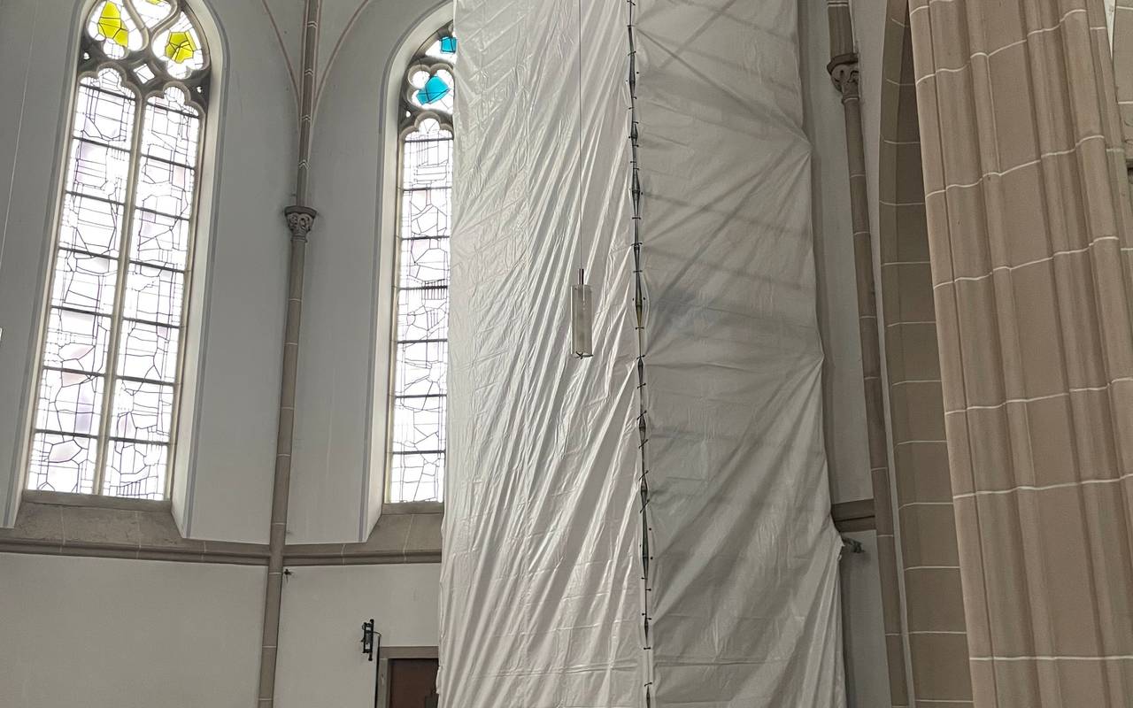 Ursprünglich sollten die Arbeiten an der Kirche St. Hubertus in Essen in 2024 fertig werden. Jetzt ist das Ziel: Herbst 2026. Es gab aber immer mal wieder Probleme, etwa mit neuen statischen Anforderungen. Und bei einem so alten Gebäude gibt es ständig Überraschungen. Zum Beispiel wurde bei den Arbeiten entdeckt, dass das Maßwerk eines Fensters kaputt ist. Das sind die Randsteine. Deswegen steht seit einiger Zeit auch innerhalb der Kirche ein Gerüst. Max Hüls nimmt es mit Humor: