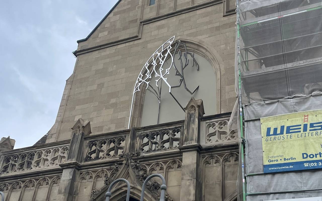 Bedingung für die Fördermittel: Ein Wettbewerb für ein Kunstwerk an der Kirche. Eine Fachjury und Vertreter aus Kirchenvorstand und Gemeinderat haben sich einstimmig für das Kunstwerk "Nexum" von Justyna Janetzek entschieden. Das wurde vor einigen Wochen vor einem ehemaligen Fenster über dem Haupteingang angebracht. Das Kunstwerk nimmt die ursprüngliche Form des Fensters im neugotischen Stil auf. Zusätzlich zeigt es ein Hirschgeweih, das symbolisch für die Heiligen Hubertus und Raphael steht.