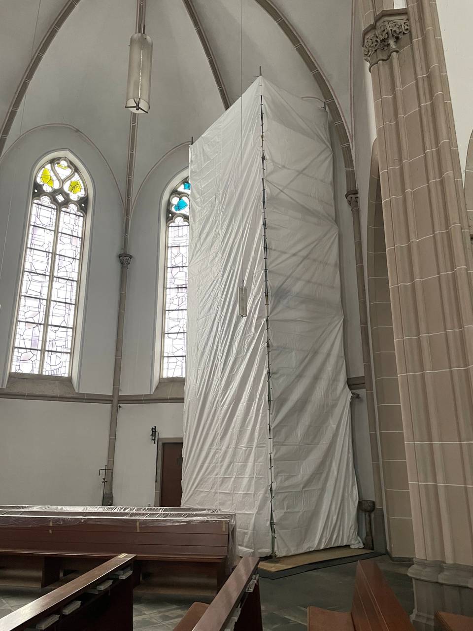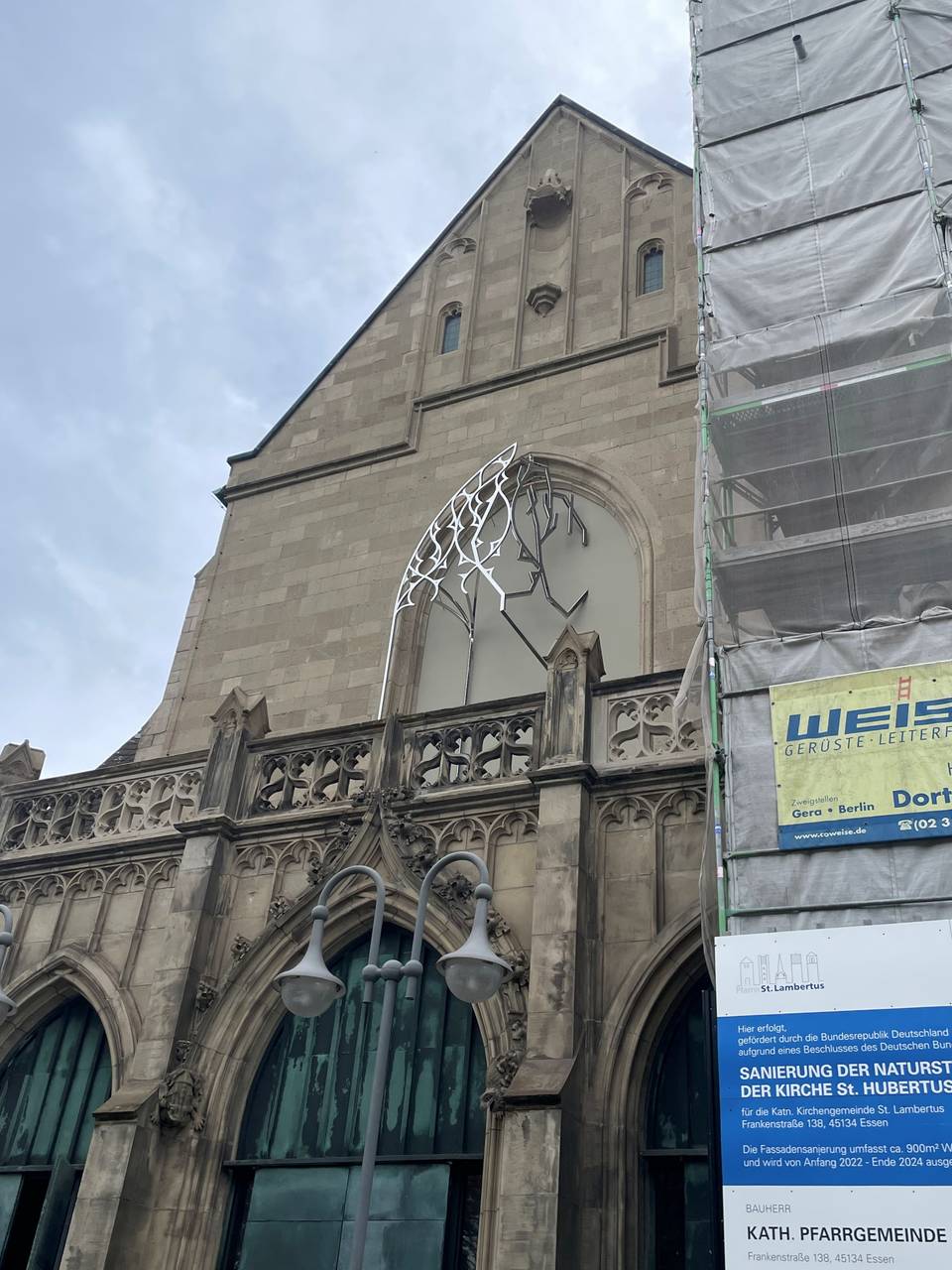 2014 ist in die Kirche St. Hubertus in Essen ein Blitz eingeschlagen. Seitdem stehen Baugerüste rundherum. Doch ein Ende ist in Sicht. Und ein neues Kunstwerk gibt es auch.