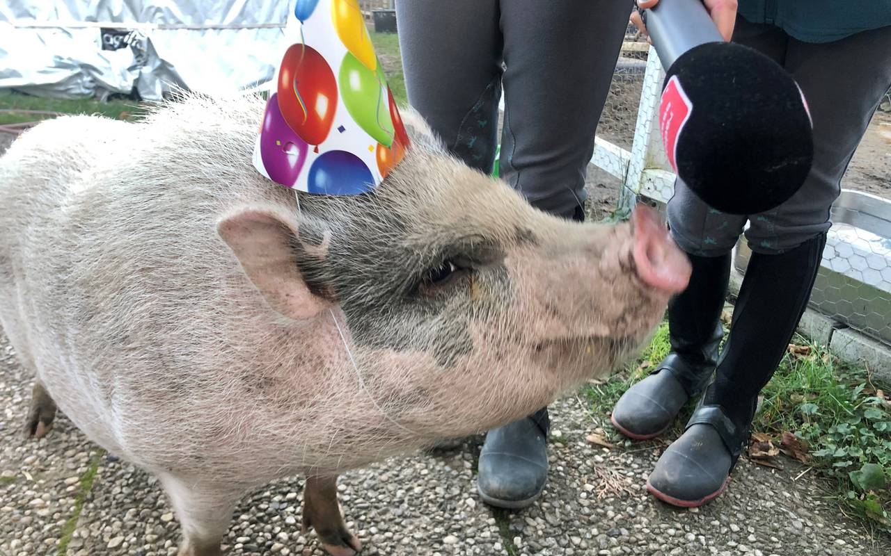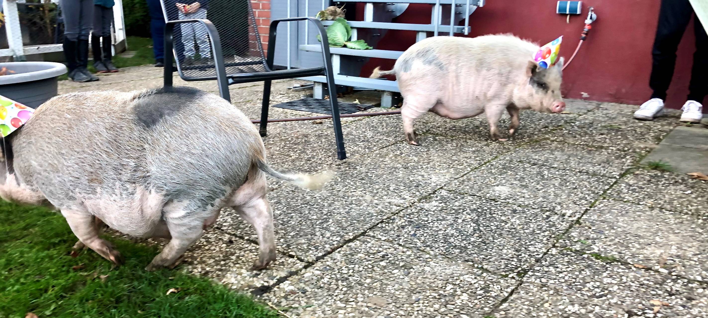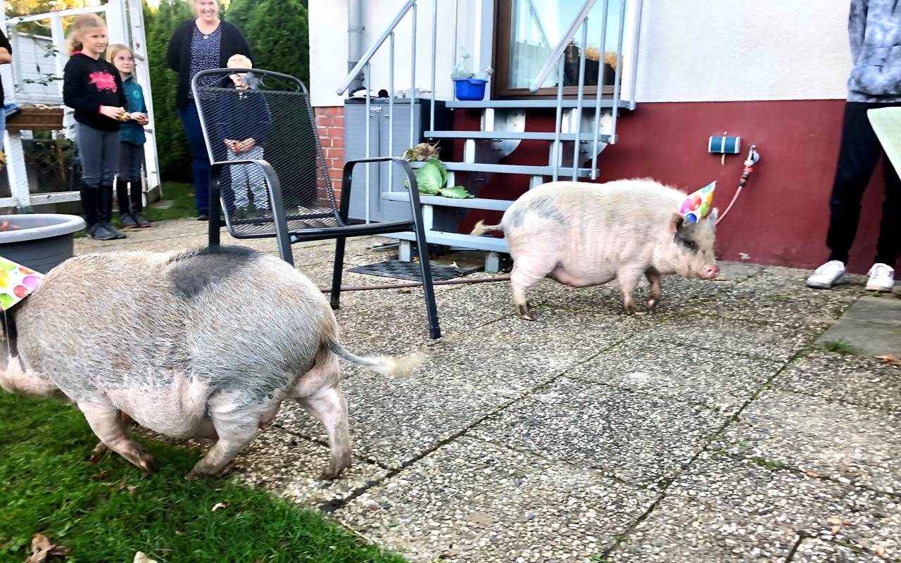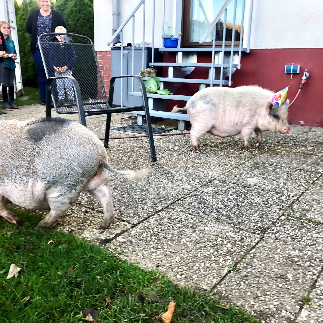 Zum ersten Schweine-Geburtstag gab es Äpfel, Kartoffeln, Kürbis und Besuch vom Radio Essen-Stadtreporter. Auch drei Kinder aus der Nachbarschaft sind gekommen und feiern mit Buddy und Molly. Die beiden Hausschweine leben seit gut einem Jahr bei Familie Marienfeld im Vorgarten und die Geschenke von den Nachbarskindern sind gern gesehen und genascht: Äpfel, Gemüse und ein Kürbis.