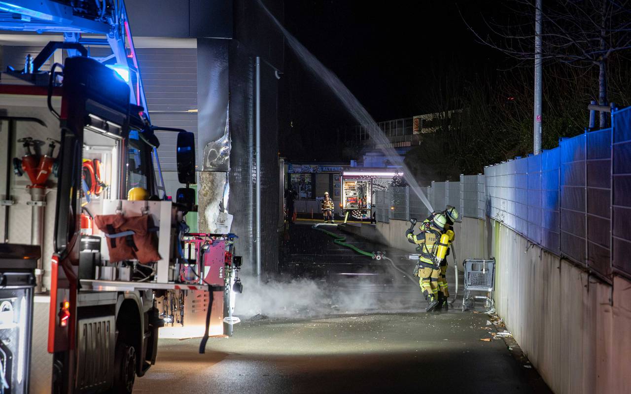 Feuer vor Discounter in Essen - Feuerwehr im Einsatz
