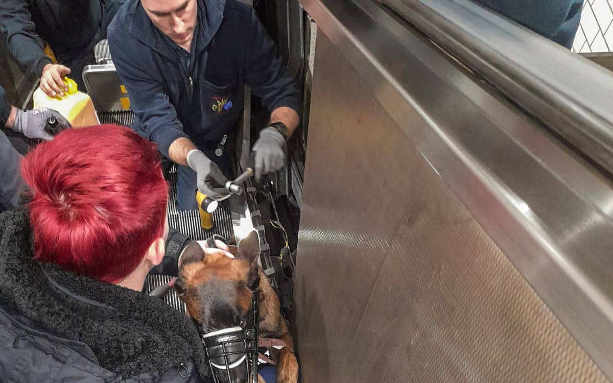 Am U-Bahnhof Karlsplatz in Altenessen hat die Essener Feuerwehr einen fünf Monate alten Schäferhund gerettet. Dieser war zwischen einer Rolltreppe und der Seitenverkleidung mit seiner Rute eingeklemmt.