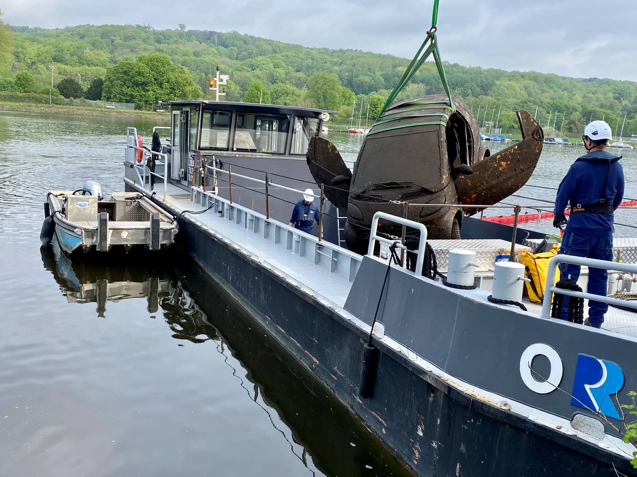 Die Bergung der ersten beiden Autowracks aus dem Baldeneysee in Essen ist geglückt. Die Feuerwehr und der Ruhrverband haben sie am Dienstag (9. Mai) mit einem Kran aus dem See in ein Boot gehoben. Es handelt sich um einen völlig verdreckten Smart und einen sehr alten Mercedes, der in der Nähe von Kupferdreh lag. Der Smart lag sechs Meter vom Hardenbergufer entfernt auf dem Grund des Sees. Der Mercedes lag ähnlich tief. Wie lange die Autos schon im Baldeneysee lagen, ist unklar. Der Smart hat noch Kennzeichen, sie sind aber nicht mehr lesbar. Die Polizei wird sich die Fahrzeuge genau ansehen und versuchen, die Hintergründe herauszufinden. In den nächsten Tagen sollen dann noch zwei weitere Autowracks aus dem See geholt werden.