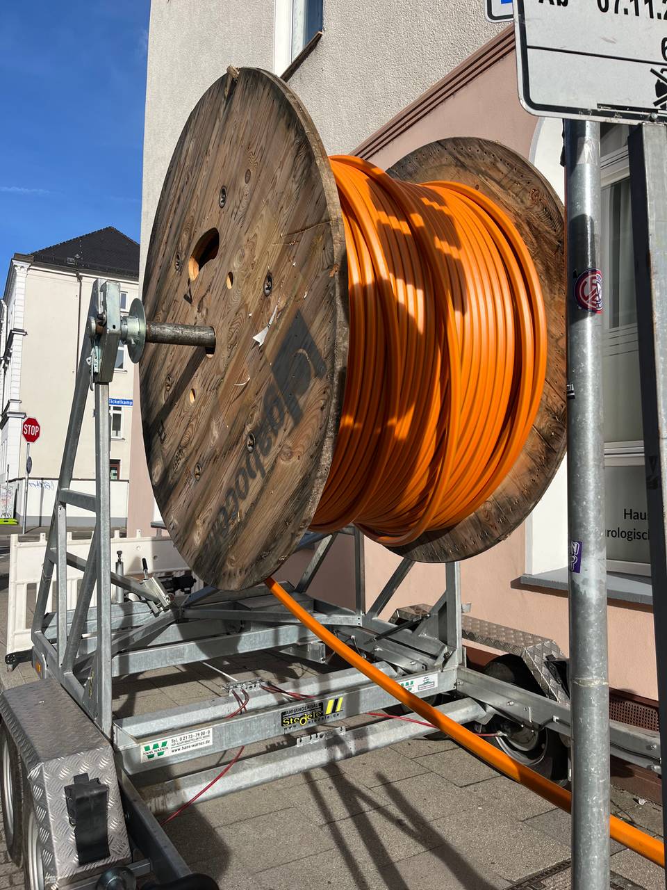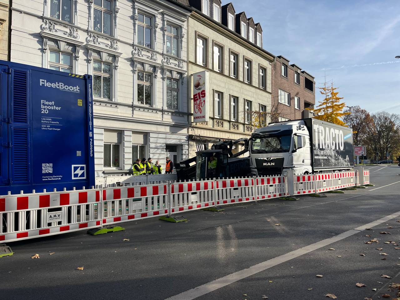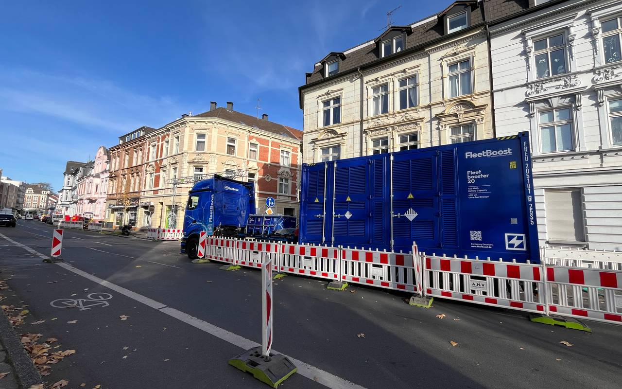 Kleine Bagger, ein Radlader, eine Horizontalbohranlage, Rüttler und eine riesige Batterie. Bis auf die riesige Batterie gibt es all diese Geräte bei der Glasfaserverlegung auch auf herkömmlichen Baustellen. Sie sind in den meisten Fällen dieselbetrieben und machen ziemlich viel Lärm. Anders als in Steele. Hier verbindet die Essener Firma GasLine gerade zwei Trassen zwischen Kupferdreh und Huttrop und versucht dabei, möglichst viele Emissionen einzusparen. Das geht mit elektrischen Geräten, die alle von einem großen Akku mit grünem Strom versorgt werden. Deswegen steht an der Baustelle am Grendtor gerade ein LKW, beladen mit einer riesigen Batterie.